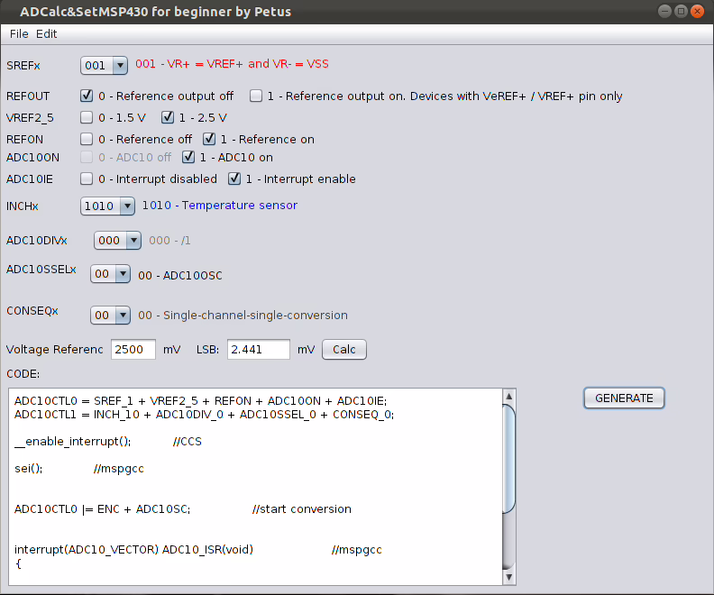 Pro širší seznámení je nutné si přečíst datasheet. Program umí ukládat kód do souboru./ This program setting AD converter and calculates least step AD converter.