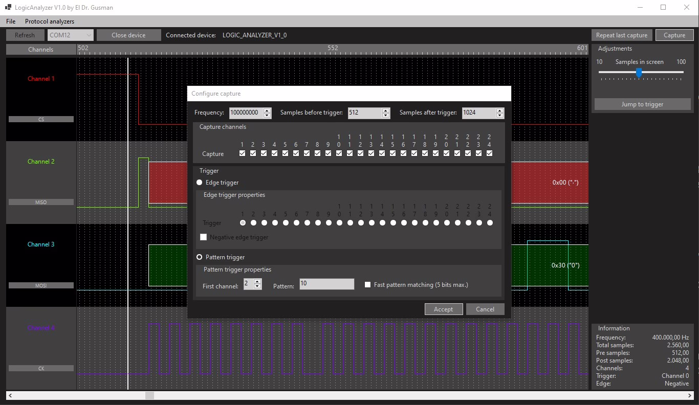 A teď software, který bývá často nejslabším článkem těchto analyzátorů. Agustín si napsal vlastní program pro Windows/Linux/MacOS. Sice vypadá použitelně, ale při delší práci s analyzátorem nejspíš dojdete do bodu, kdy si řeknete, že „Kdyby autor použil Sigrok, byl by to úžasný nástroj“. Bohužel, Tento logický analyzátor není momentálně podporován programem Sigrok, protože autorovi, jak sám uvedl, zabralo méně času napsat si vlastní program a autor má také s programem Sigrok velmi negativní zkušenosti.