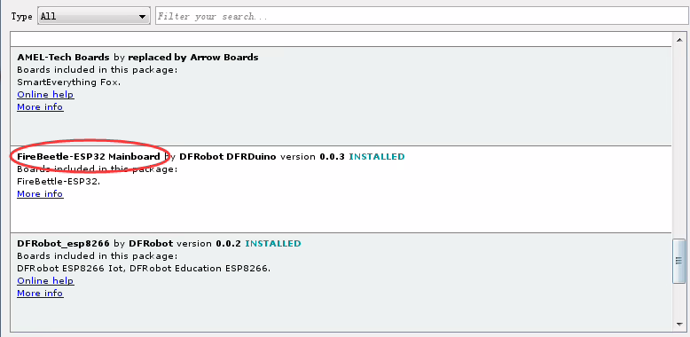 Vyberte „(FireBeetle-ESP32 Mainboard)‘ a klikněte na „Install‘. Správce automaticky stáhne příslušné knihovny.