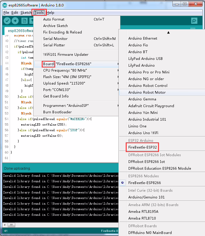 Otevřete Tools -> Board (v české verzi Nástroje -> Vývojová deska) a zvolte Firefly-ESP32, jak je zobrazeno v následujícím okně: