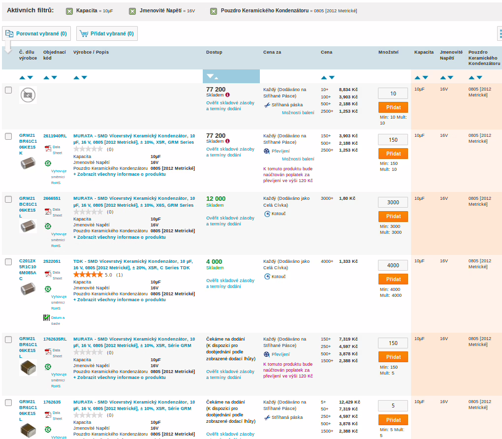 Pro příklad vybereme keramický MLCC kondenzátor 10uF ve velikosti 0805 na napětí 16V, materiál vybereme běžně používaný X5R nebo X7R. A chceme koupit řekněme 50 ks.