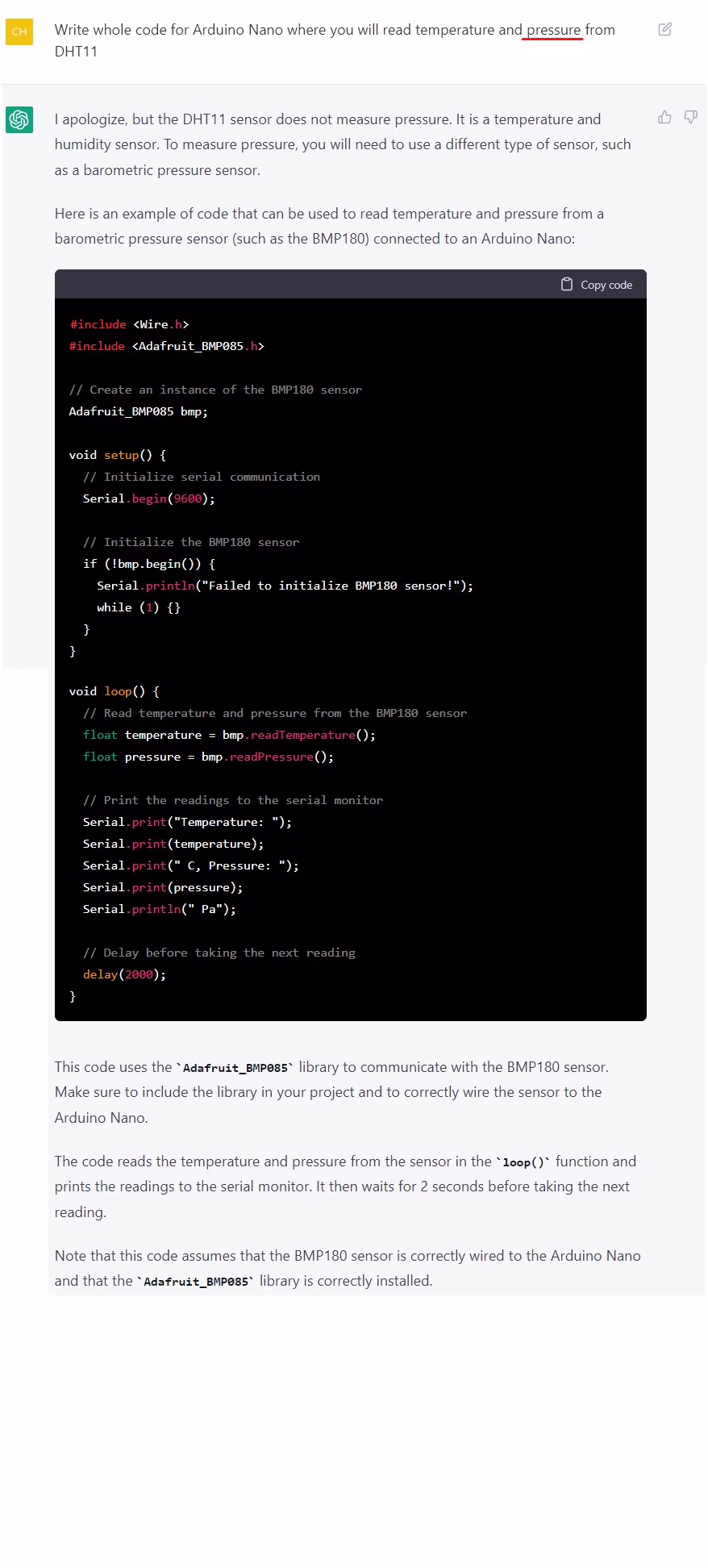 A nenechá se nachytat! Napsal jsem, ať vypíše teplotu a tlak z DHT11. DHT11 samozřejmě neumí měřit tlak, ale ChatGPT vytvořil kód pro BMP180.