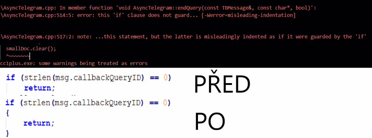 Po nějaké době jsem se pustil do kódu, kde jsem použil knihovnu AsyncTelegram (ano, už je novější verze AsyncTelegram2). Z nějakého důvodu (aktualizace kompilátoru, knihovny?) mi Arduino IDE v2.1.1 začalo hlásit chybu