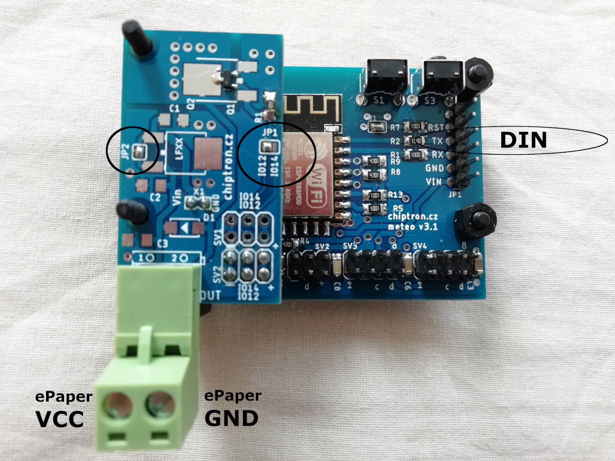 Napájení připojte přes power shield, jak je zobrazeno níže. Na desce MeteoV3 propájíte pájecí most JP2 (3.3V). Na power shield vyberte řídící GPIO ke spínání napájení (GPIO12[můj případ] nebo GPIO14) a propájíte JP2 (propojení VCC – 3.3V na vstup napájení ePaper).