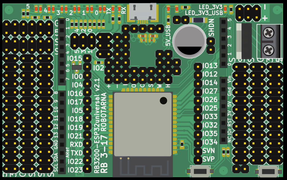 Na desce RB3200-ESP32universal naleznete arduino uno rev.3 konektor, zdroj napětí 5V (USB) i 3.3V dostupné na pin header, LEDky, USB-UART převodník CP1202 a spoustu pin headerů pro zapojení vašich senzorů nebo tlačítek.