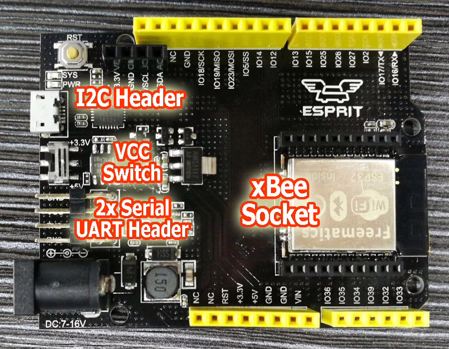 Kromě samotného ESP32 modulu naleznete na desce ještě Arduino kompatibilní konektory Uno rev.3.