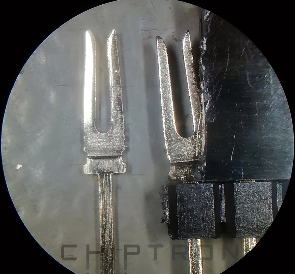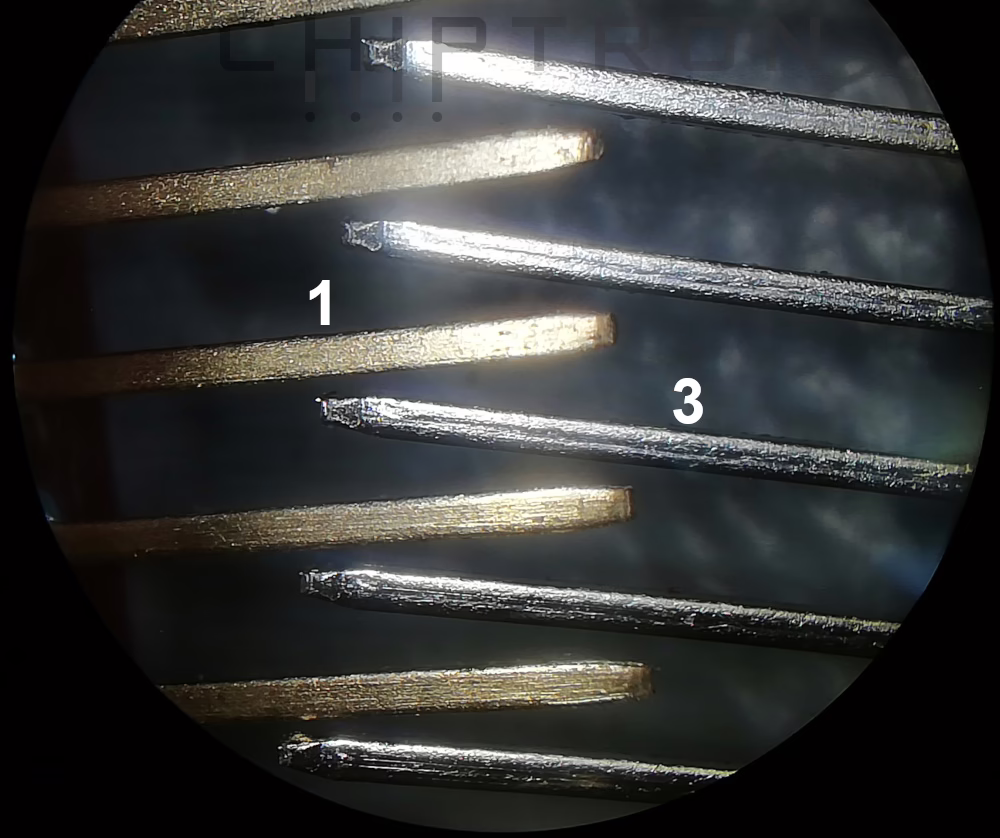 Pin, kromě nekvalitního pokovení, je téměř o polovinu tenčí než obvykle koupený. To je samozřejmě znát na velmi nízké mechanické odolnosti a špatné pokovení zase přispívá k vyššímu odporu – u zařízení se vám může stát, že úbytek napětí vlivem vyššího tekoucího proudu bude tak velký, že se vám třeba čip resetuje.