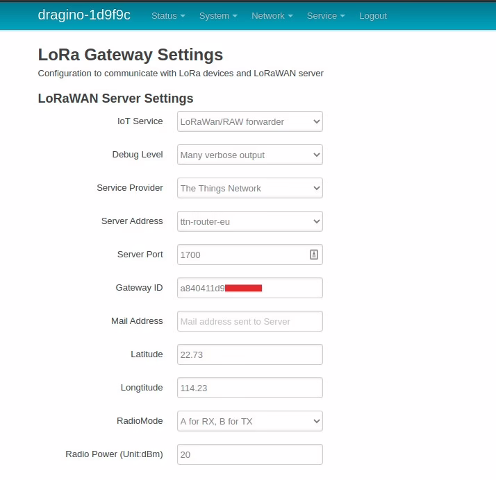 Pro nastavení LoRa gatewaye je potřeba v horním menu rozkliknout záložku Service a následně podzáložku LoRaWan GateWay.