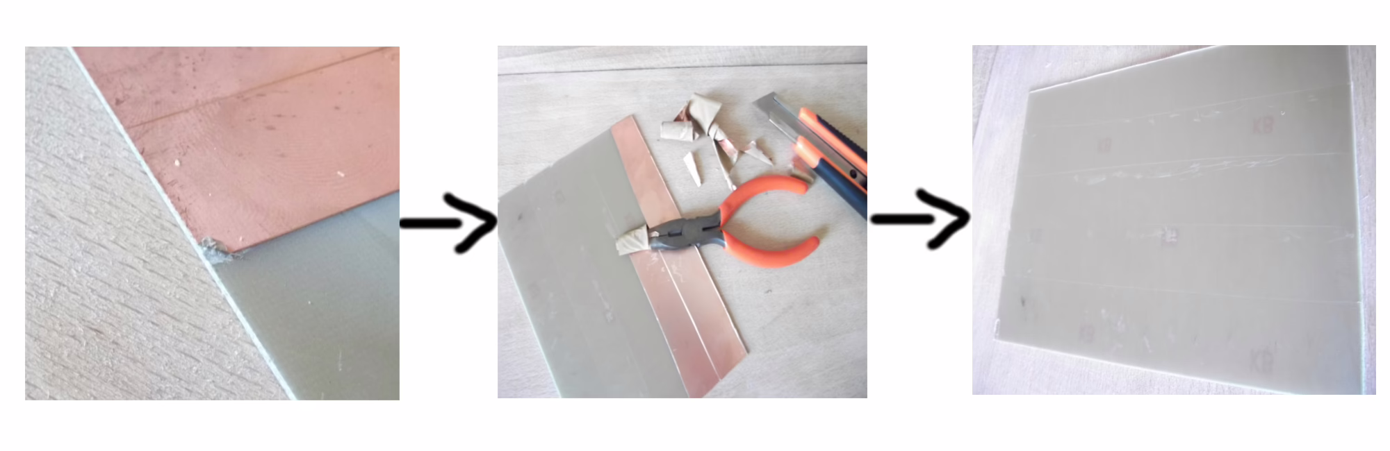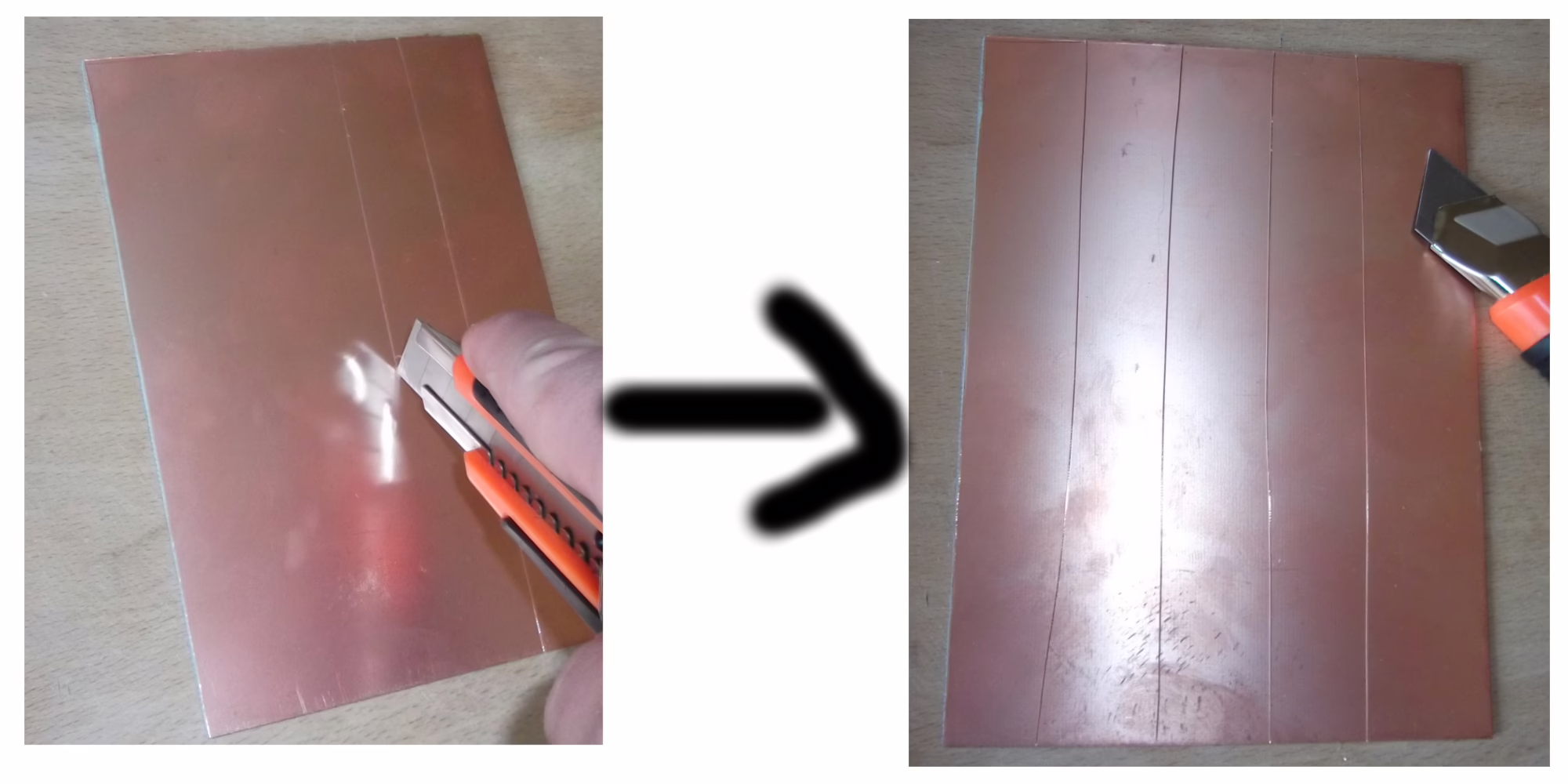 Můžeme „stáhnout“ celou měď, ale v případě DPS ve velikosti A4 to opravdu není žádná sranda a je zapotřebí minimálně dvou lidí. Proto je jednodušší si desku rozřezat na „pásky“. Nožem se musíte dostatečně narušit měděnou vrstvu, ale zároveň se snažte, abyste moc nepoškrábali podklad DPS.