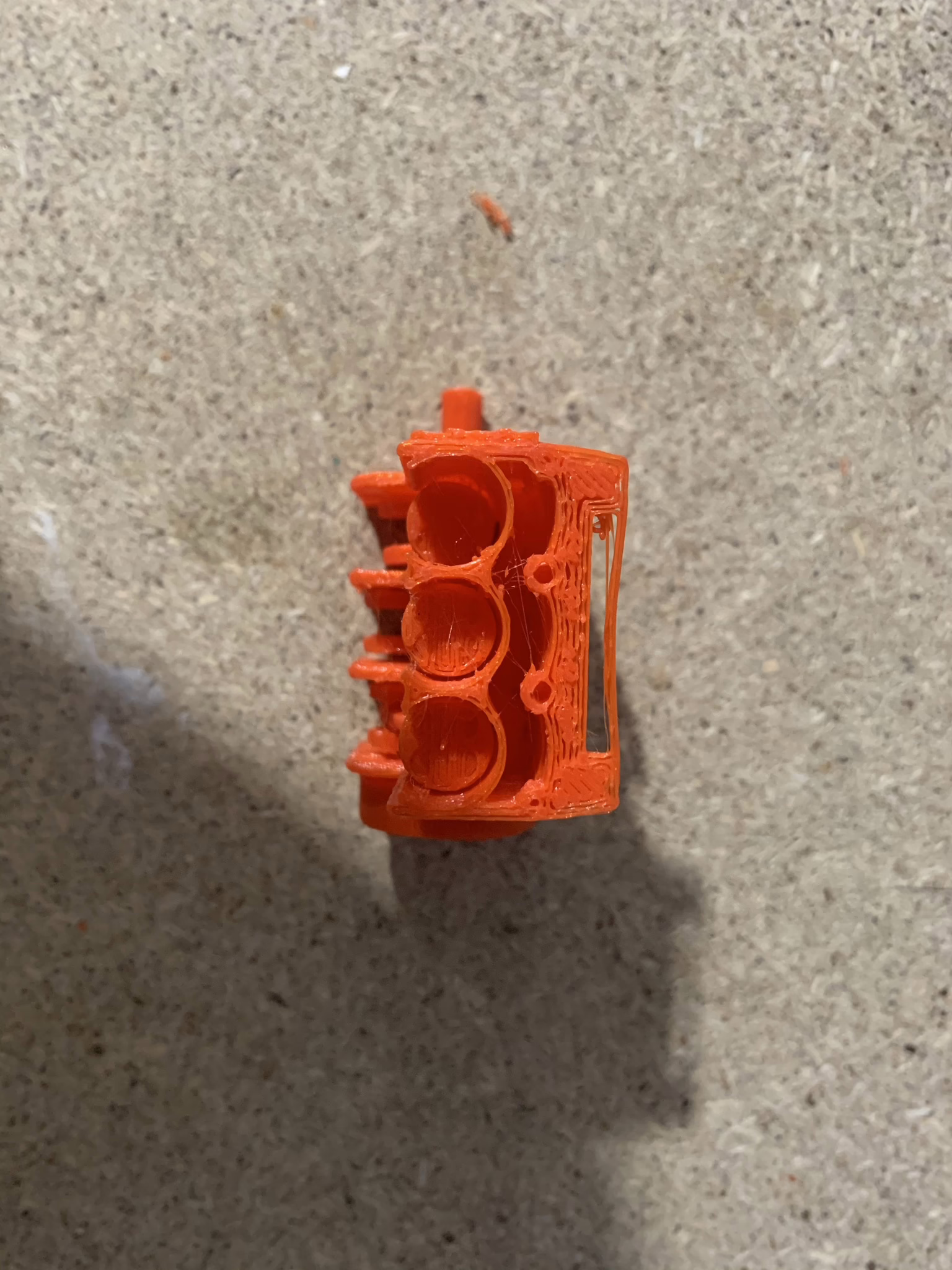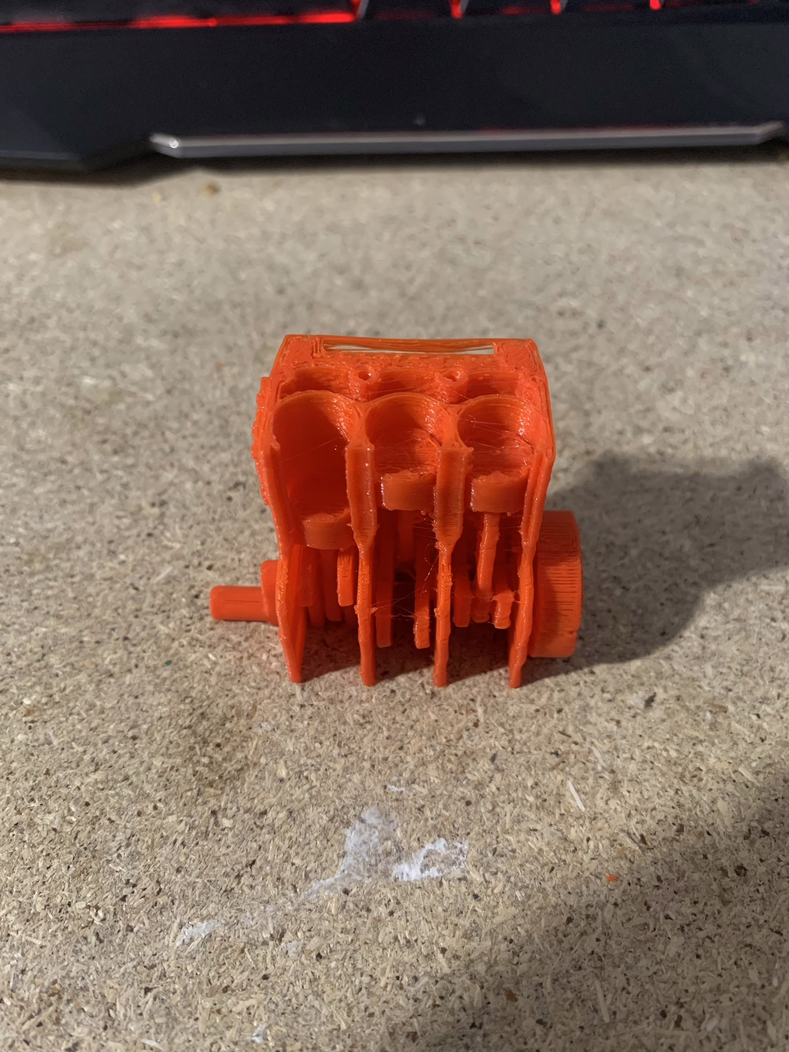Tiskárna vytiskla na první pohled naprosto nádherný objekt ovšem při pokusu o odlepení z podložky se mi objekt rozpadl v ruce. Myslel jsem, že na vině je moc výkonný ofuk a proto jsem dal tisknout další objekt. Tentokrát jsem zvolil nový testovací objekt na přesnost tisku, krásný manuální tříválcový motor, ovšem s naprosto stejným výsledkem, vrstvy naprosto nechtěli držet při sobě.