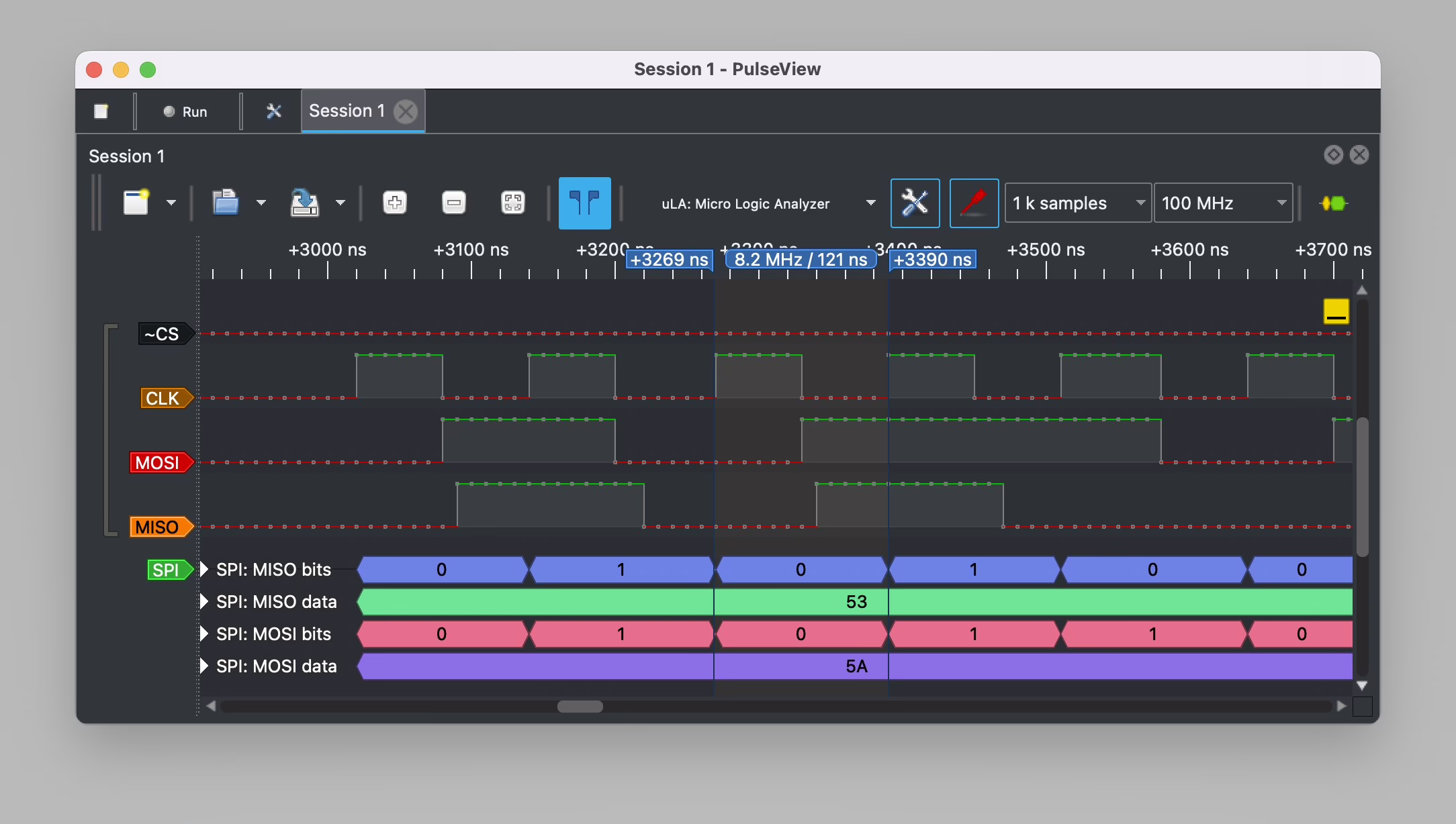 Jeho ale největší předností je podpora v PulseView (Sigrok), to je GUI pro vizualizaci a dekódování dat. Po Saleae asi druhý nejpopulárnější a multiplatformní. A tento μLA je podporován – ne ve výchozím nastavení, ale je možnost si jej nastavit – přehledně podle návodu na github projektu.