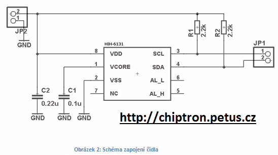 Navrhněte a sestavte zařízení pro měření teploty a vlhkosti vzduchu. Pro měření bude použit snímač HIH-6131 připojený k mikropočítači přes sběrnici I2C. Po zmáčknutí tlačítka mikropočítač přijme od snímače naměřené hodnoty a zobrazí je na několik vteřin na displeji. Poté přejde do stand-by režimu a bude čekat na další stisk tlačítka.