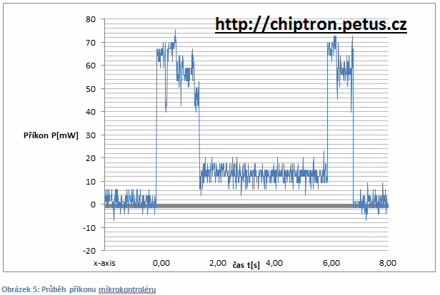 Průběh proudu odebíraného mikrokontrolérem je na obrázku 4. Maximální odebíraný proud je 23 mA. Staticky změřený proud během režimu stop je 3 mA a během stand-by režimu 2 μA. Při opakovaném spouštění každých deset sekund by tak byl průměrný proud mikrokontrolérem 6,3 mA a jeho průměrný příkon 21 mW. S prodlužujícím se intervalem spouštění by se spotřeba energie díky nízkému příkonu ve stand-by režimu významně snižovala.
