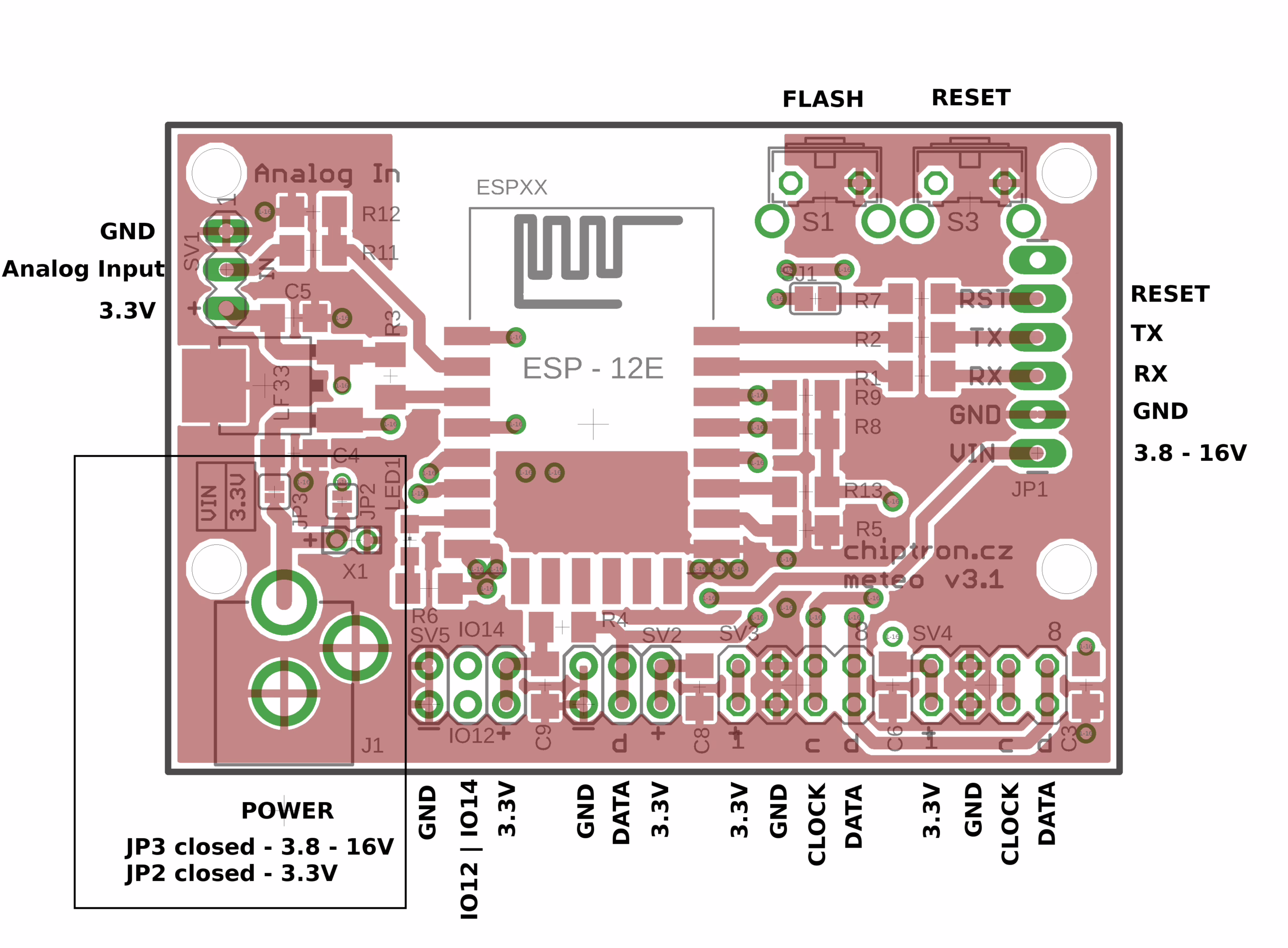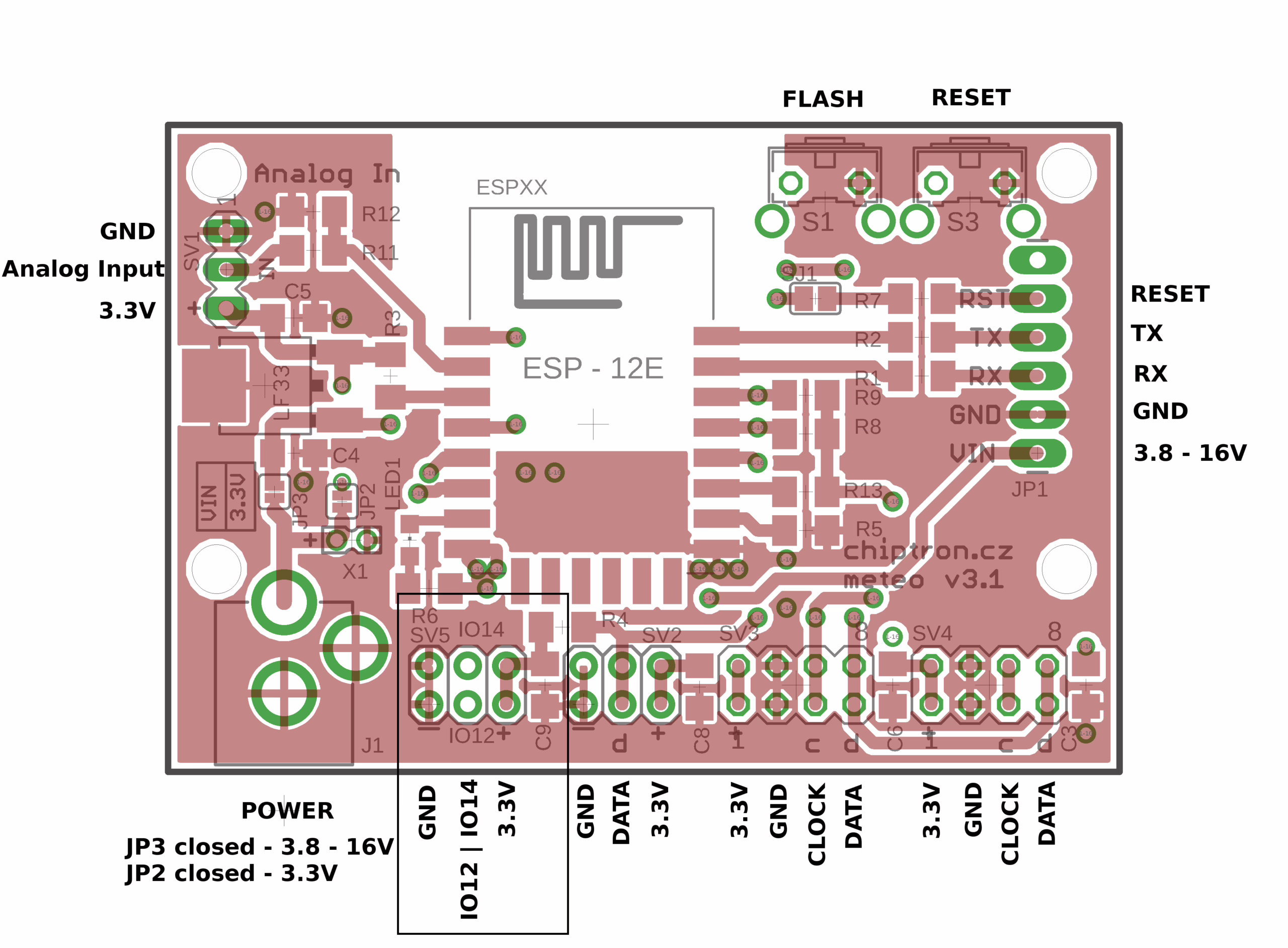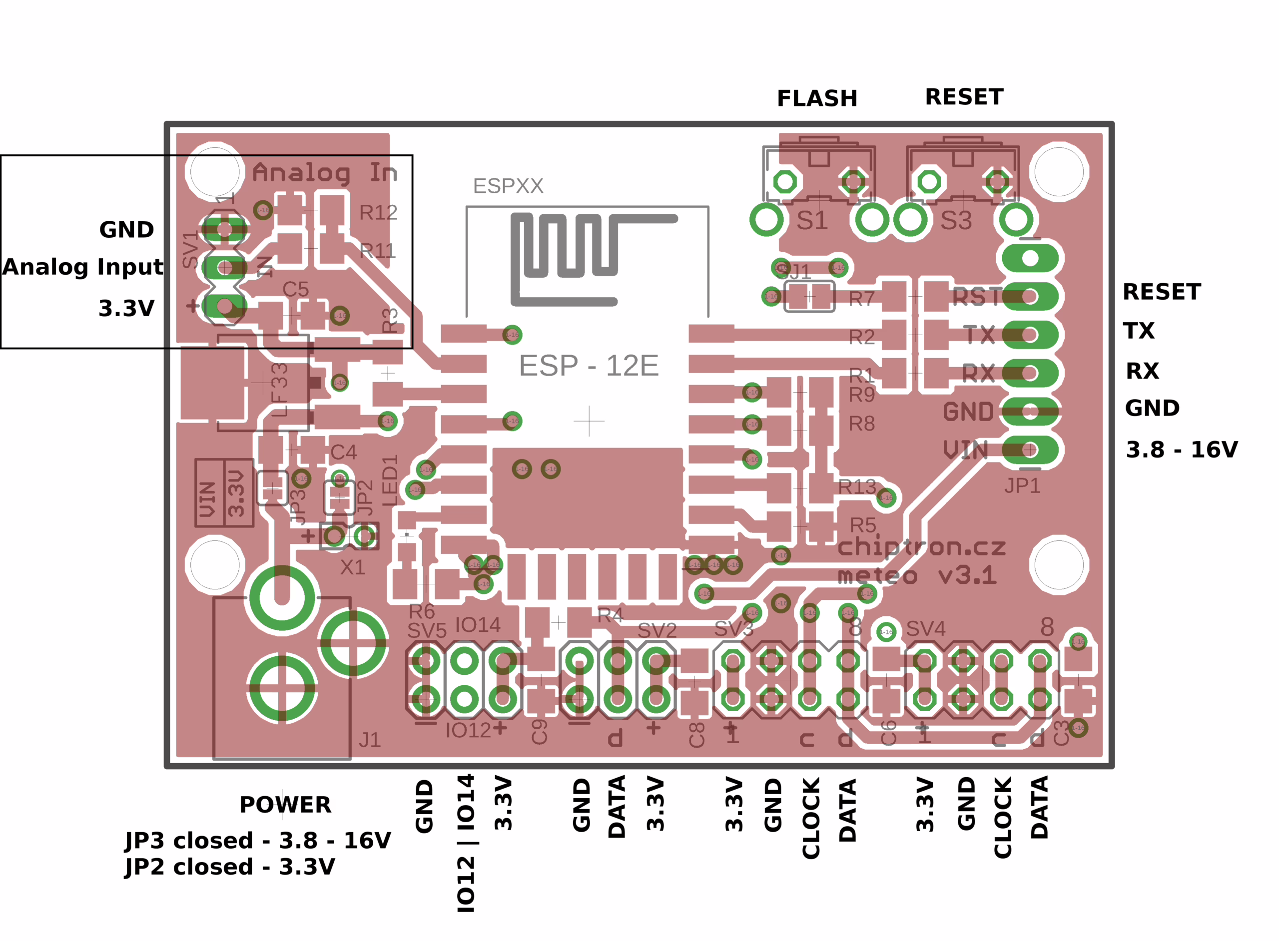 Tento projekt Meteo v3 už není jenom deskou určenou pro meteostanici. Díky vhodnějšímu napájení (souosý konektor) jednoduše připojíte baterii nebo solární článek. Stačí přepájet pájecí most – JP2 pro přímé napájení modulu 3.3V, JP3 pro napájení od 3.8 až 16V.