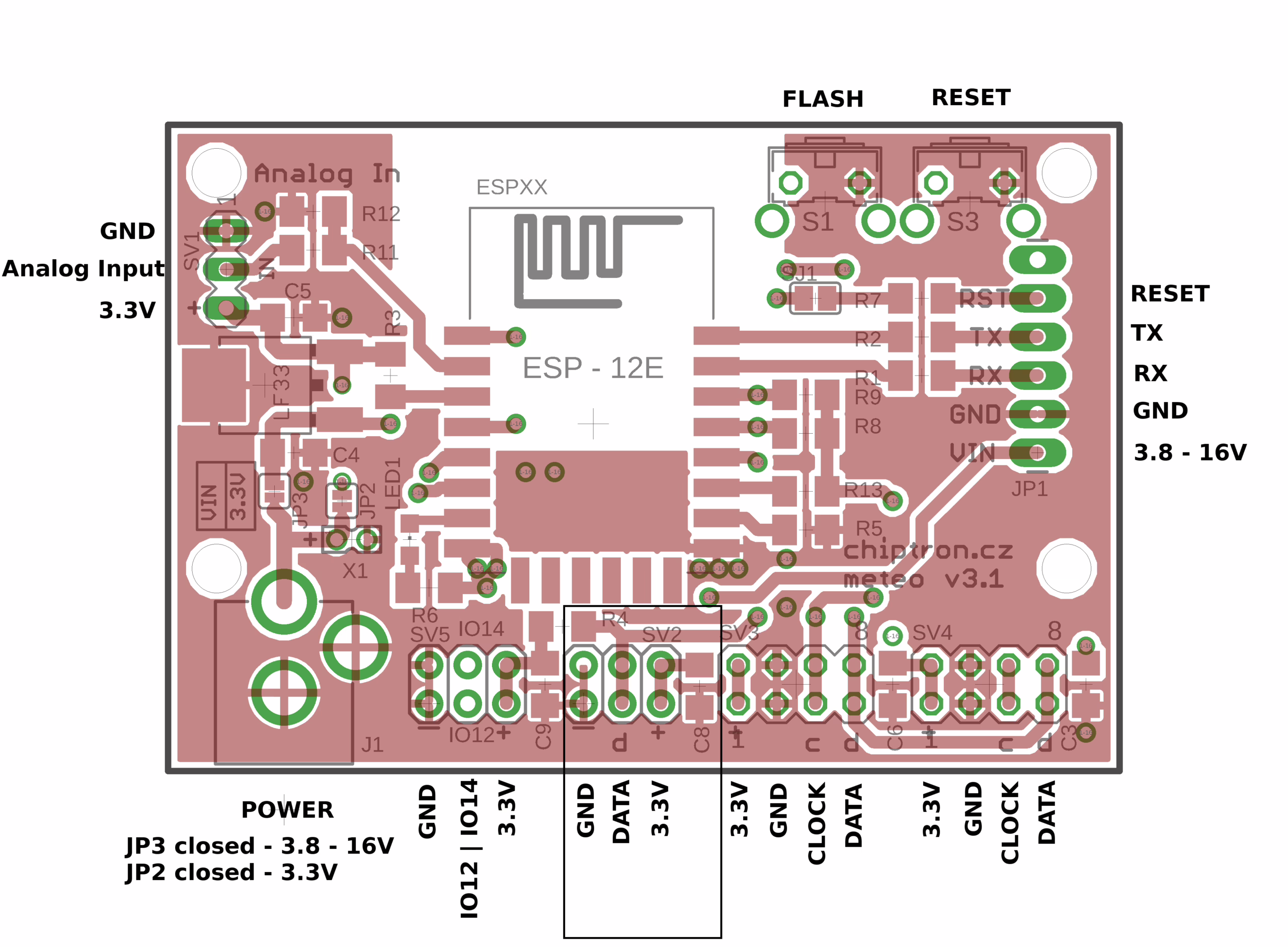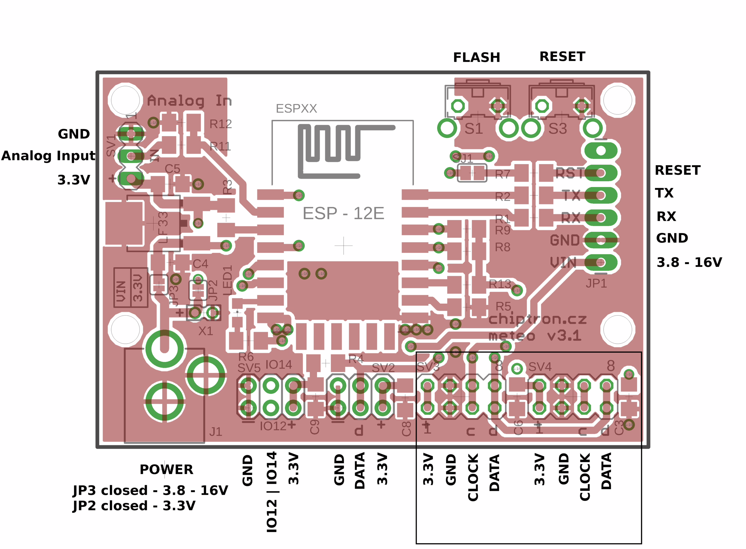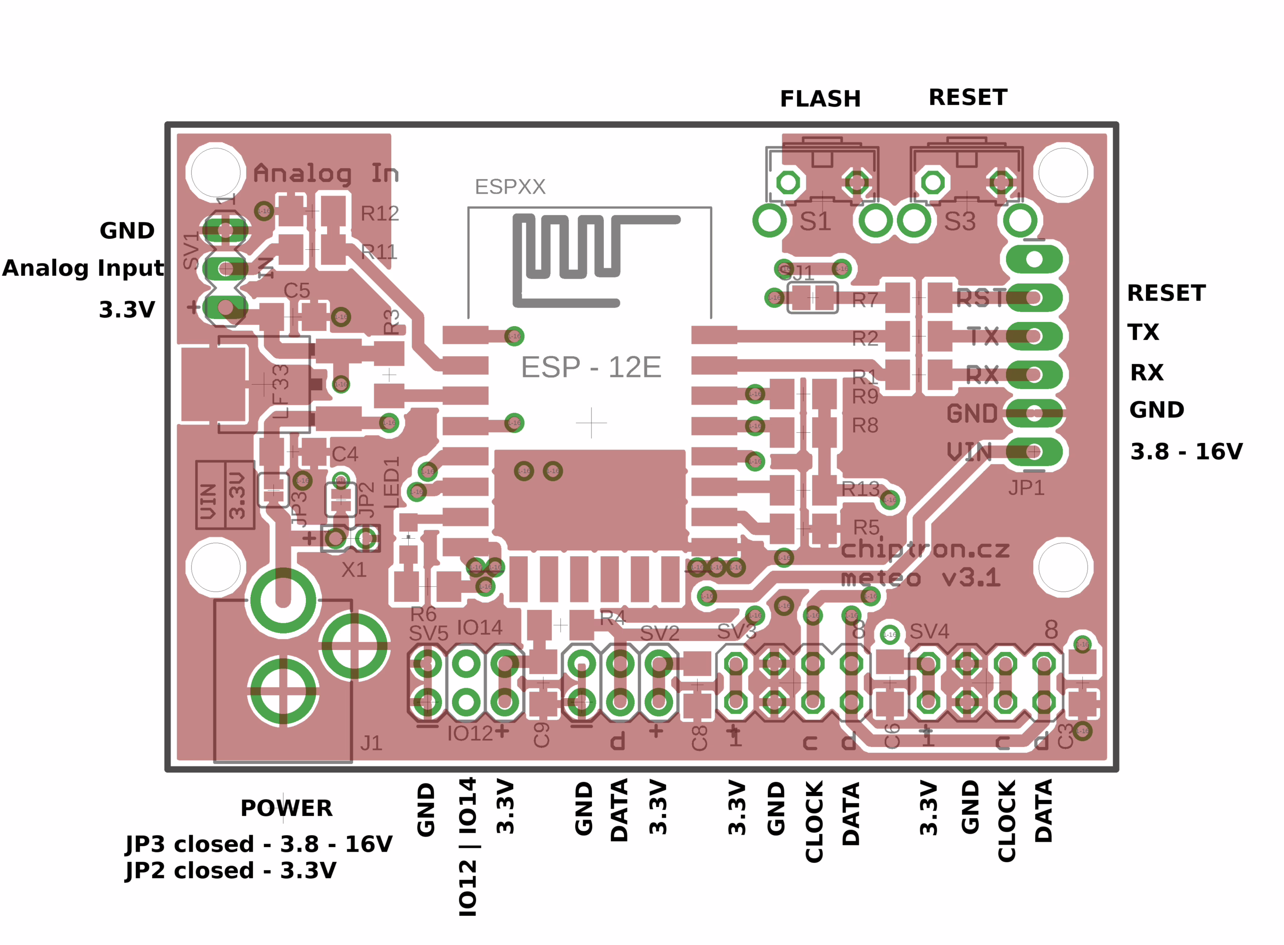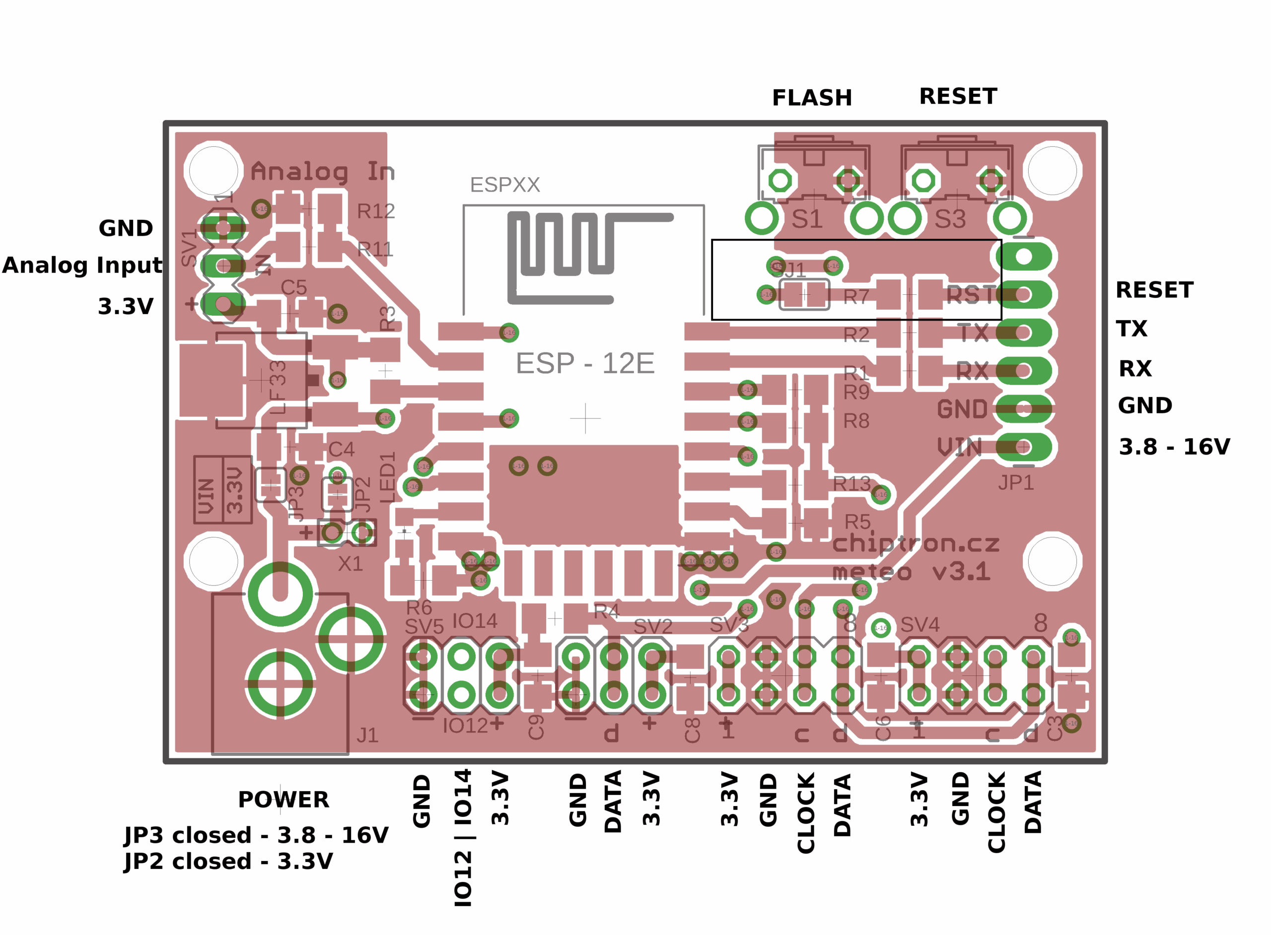 Tento projekt Meteo v3 už není jenom deskou určenou pro meteostanici. Díky vhodnějšímu napájení (souosý konektor) jednoduše připojíte baterii nebo solární článek. Stačí přepájet pájecí most – JP2 pro přímé napájení modulu 3.3V, JP3 pro napájení od 3.8 až 16V.