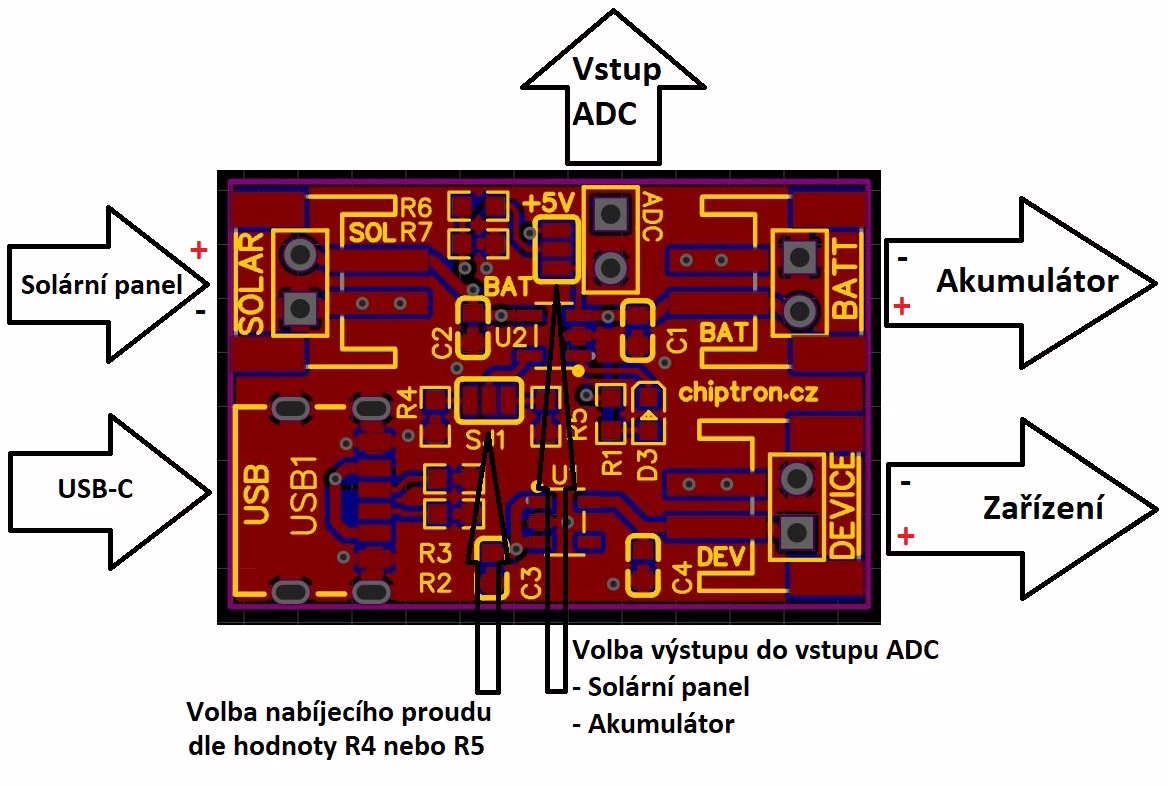 Na modulu jsou dva pájecí mosty – jedním vybíráte vstup pro AD převodník (solární panel/akumulátor) a druhý pro hodnotu nabíjecího proudu.