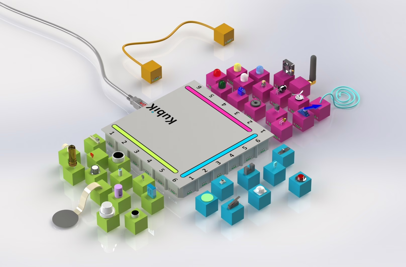 Magnetické kostičky jsou rozděleny do tří skupin. Vstupy digitální (tlačítko, přepínač, PIR senzor, kapacitní snímač), vstupy analogové (snímače teploty, vlhkosti, tlaku, mikrofon, potenciometr, tahový trimr) a výstupy (jedno i více barevné LED diody, siréna, ventilátor, DC motor, světelné vlákno). Nabídka kostiček je velká, a pokud máte k dispozici 3D tiskárnu, můžete si vytvořit prvky vlastní. Autoři nabízí modely ke stažení.