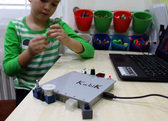 Stavebnice „KubiK“, jak ji autoři nazývají, využívá jednoduchého principu. Hlavní jednotku připojíte USB kabelem k počítači, vyberete si jednu z nabízených kostiček (LED diodu, tlačítko, otočný knoflík…) a přes magnetické kontakty vše propojíte. Zvolíte si obtížnost programování (jednoduché grafické, složitější basic nebo klasický jazyk C) a programujete.