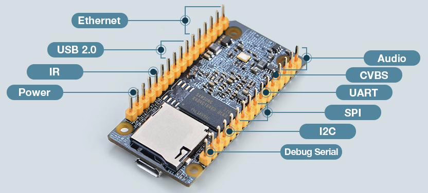 Na pinových headerech, které jsou umístěny po stranách desky, naleznete ethernet připojení, USB 2.0, debug serial port, I2C, SPI, UART, CVBS display rozhraní (kompozitní výstup) a Audio.