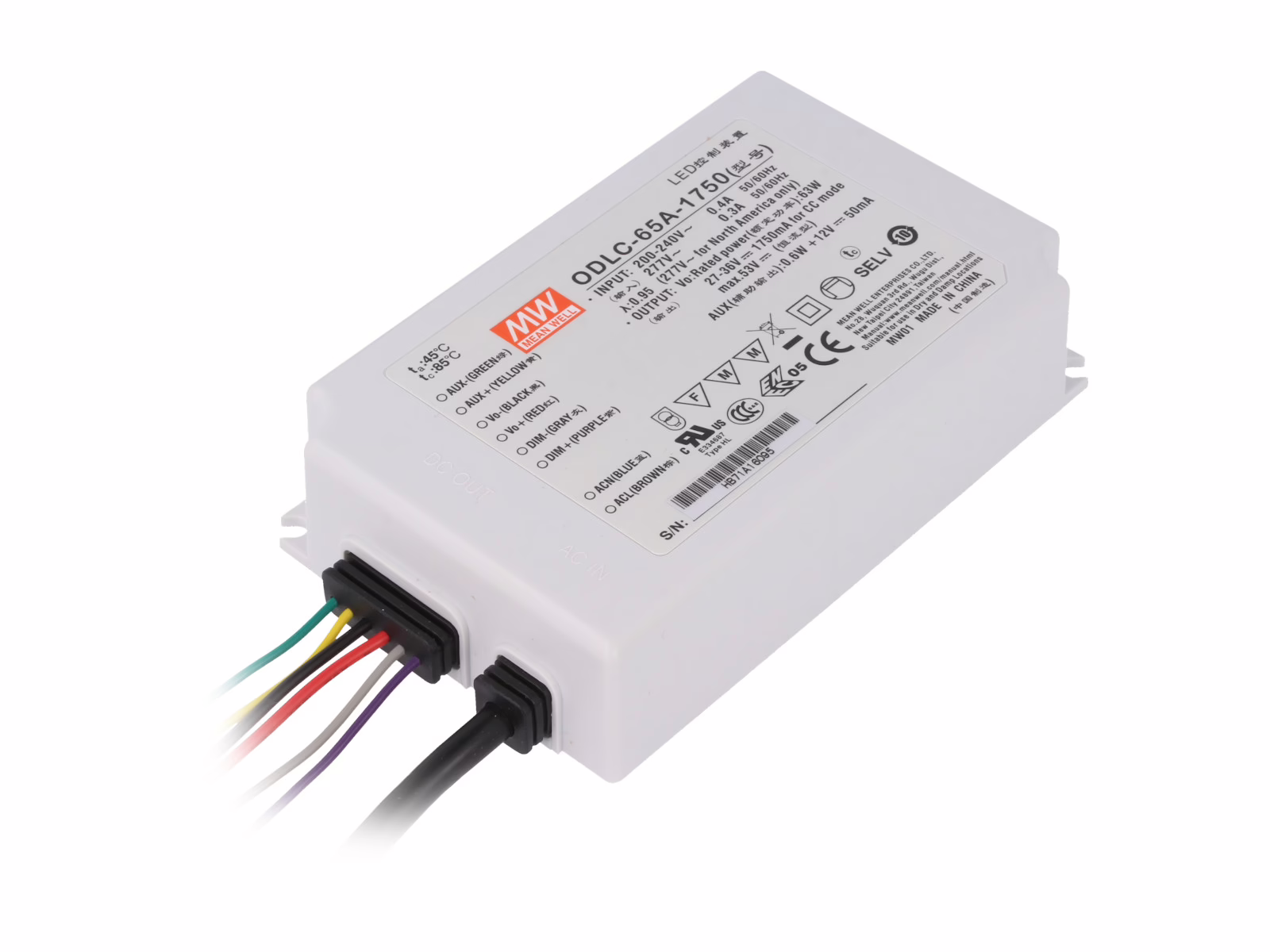 Řada ODL obsahuje napájecí zdroje vyrobené se stupněm krytí IP67. Řada ODLC zahrnuje proudové napájecí zdroje (CC). Řada ODLV zahrnuje napěťové napájecí zdroje (CV). Obě řady mají vstup pro stmívání 0… 10 V a ODLC mají stmívání pomocí DALI. Napájecí napětí se pohybuje od 90 do 295 V AC a napájecí zdroje jsou v souladu s třídou II/2. K dispozici je také 12V výstup pomocného napětí, který lze použít k napájení externích zařízení, např. IoT. V nabídce jsou varianty o výkonu 25, 45 a 65 W.