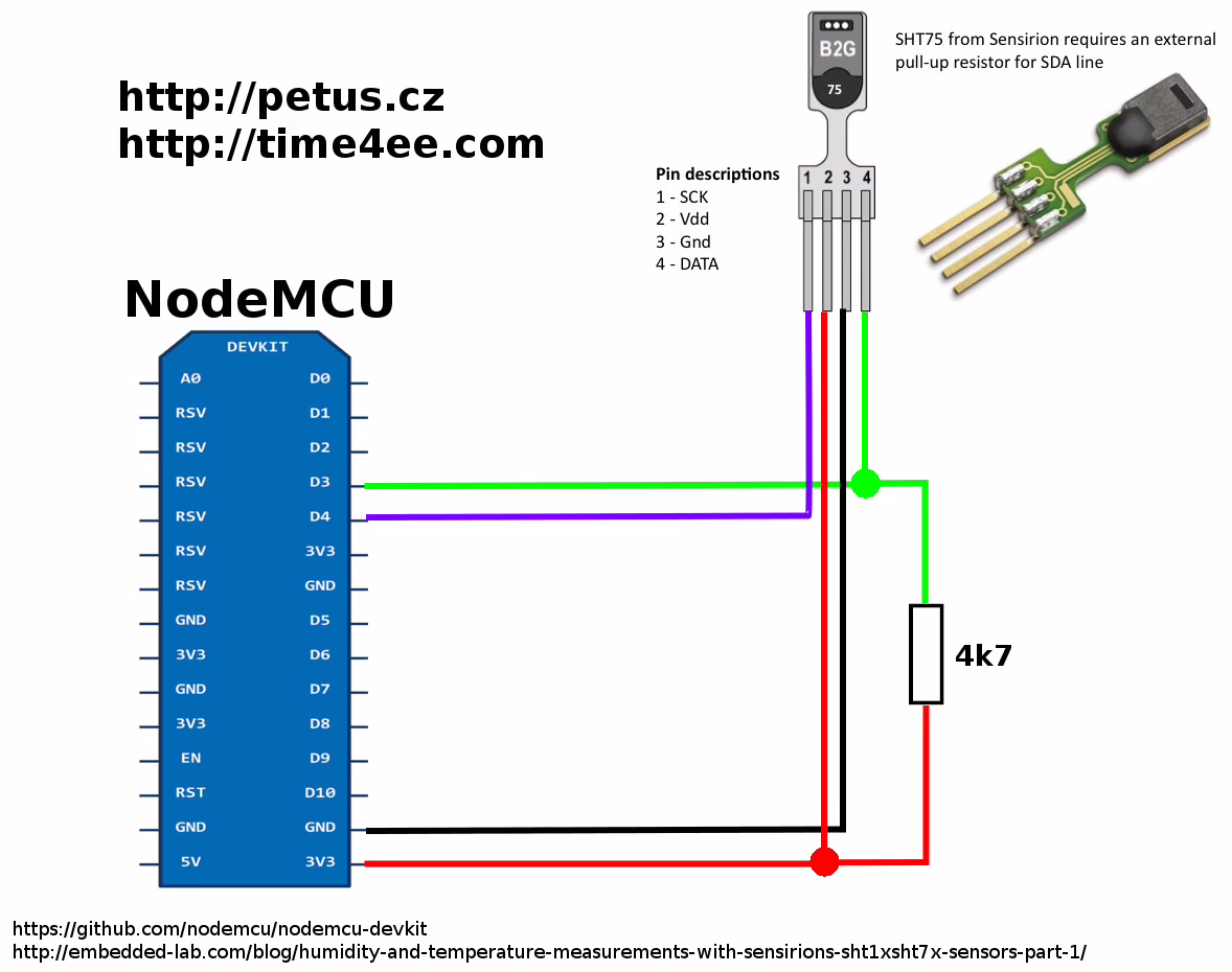 A nakonec padla volba na NodeMCU (ESP8266. ESP-12). Jako programovací jazyk jsem mohl zvolit Lua, microPython nebo wiring v Arduino IDE. Našel jsem knihovnu pro SHT75 a Wi-Fi komunikaci (GET request) a tak jsem zvolil Arduino IDE (Všichni, kdo mě alespoň trochu znáte, že obliba Arduino se limitně blíží k nule, ale abych mohl kritizovat, musím to vyzkoušet).