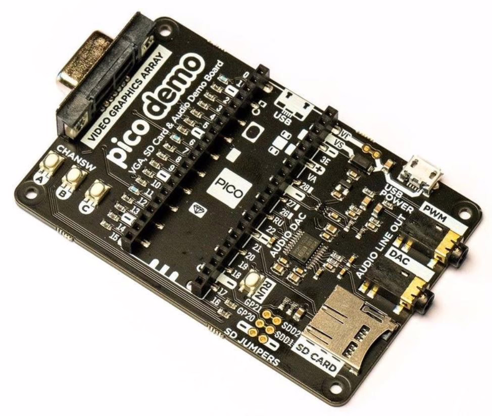 Pimoroni Pico VGA Demo deska byla vytvořena speciálně pro ukázku bohatě vybaveného čipu RP2040 pro Raspberry Pi Pico. Deska má výstup VGA, slot pro kartu SD, digitální zvukový výstup I2S a mnoho dalších šikovných funkcí.