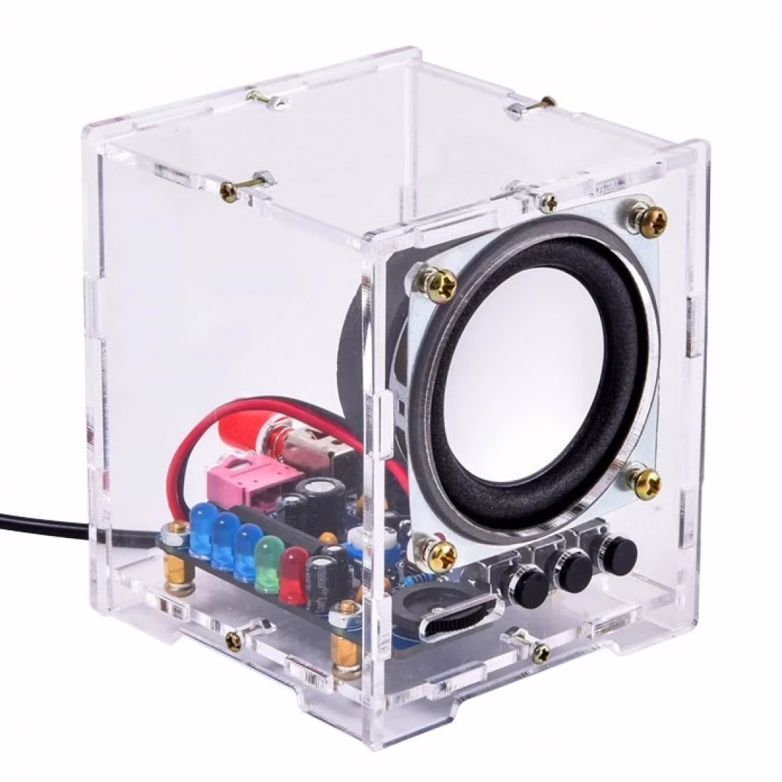 Stavebnice aktivního reproduktoru s LED indikací vybuzení a Bluetooth modulem. Výsledný produkt z čirého akrylátu vypadá velmi působivě a je plně funkční. Reprobednička obsahuje zesilovač a pět LED diod pro indikaci vybuzení. Hlavními součástmi jsou 3W audio zesilovač HT6872 a VU meter s obvodem KA2284. Napájení 5V je přivedeno pomocí USB kabelu a tím je možné napájet reproduktor pomocí powerbanky, adaptéru nebo přímo z počítače.