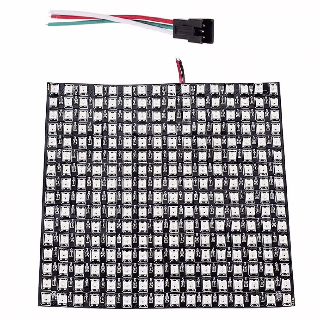 Modul je osazený 256 inteligentními LED diodami WS2812 Neopixel. Kazdá dioda lze nastavit samostnatně a lze nastavit jak barvu, tak intenzitu vyzařovaného světla. Nastavení je pro každou diodu zvlášť! Modul má čtyři piny, napájení (VCC a GND) a datové piny DI (data vstup) a DO (data výstup). Díky výstupu DO lze zapojit moduly seriově a k ovládání všech modulů stále stačí 1 datový vodič z mikrokontroleru. Odběr jedné barvy LED je při plném svitu 20mA, při klidu 1mA. Panel s 256 LED může dosahovat maximálního odběru až 15.3A (3 barvy * 20mA * 64 LED).