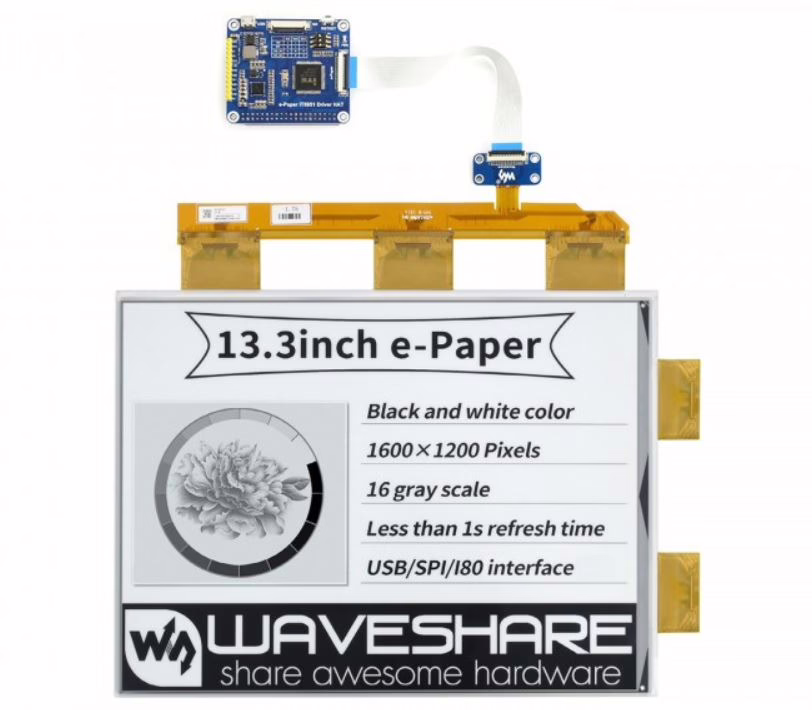 Černobílý e-Paper displej HAT, 16 stupňů šedé, s úhlopříčkou 13,3″, USB/SPI/I80 rozhraním a rozlišením 1600×1200 bodů.