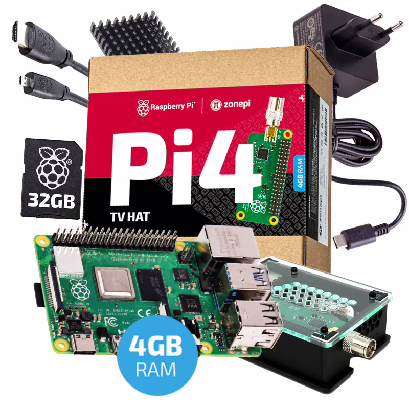 RPI 4B TV HAT obsahuje Raspberry Pi 4 Model B – 4GB RAM, Raspberry Pi TV HAT a krabičku. Dále zde najdete hliníkový chladič, Raspberry Pi USB-C 5,1V⎓3A napájecí zdroj, 32GB microSDHC Class 10 UHS-I U1 A1 s NOOBS & Raspberry Pi OS a 2m microHDMI kabel.