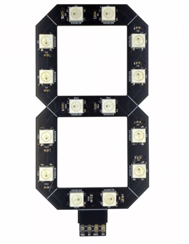 Segmentová číslice s RGB LED. Slouží k zobrazení času a dalších numerických hodnot. Číslice jsou ovládané mikropočítačem, připojené na jeden pin a spojené do série stejně jako led pásek.