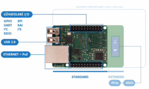 Na modulu najdete RAM o velikost je 512 MB a FLASH 4 GB (eMMC).
