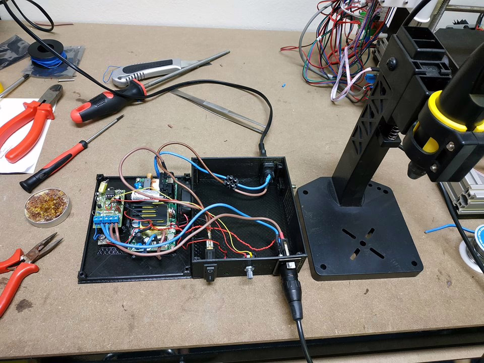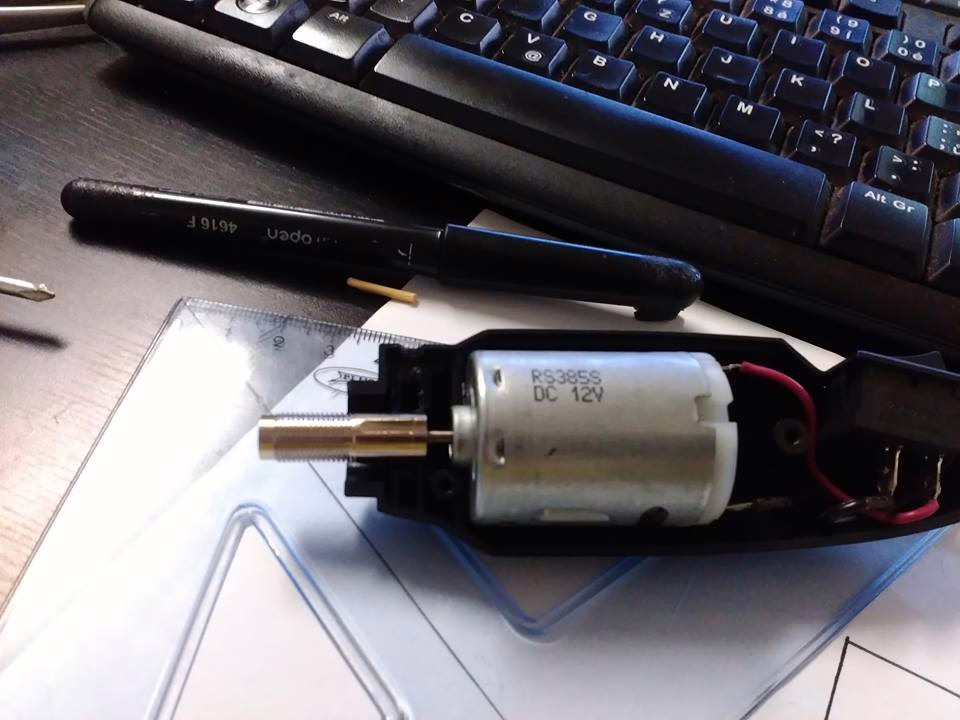 Z originální vrtačky zbyl jen plastový plášť a osička pro uchycení sklíčidla. Původní motorek jsem vyměnila za modelářský MIG 400 na 12 voltů, doplnila jsem přepínač směru otáček a původní sklíčidlo na kleštiny jsem nahradila sklíčidlem Proxxon 28941. Osičku jsem z původního motorku sundala zahřátím na cca 200 stupňů pomocí horkovzdušné pistole. Na nový motorek jsem ji pak přilepila fixátorem Loctite 648. Otvor pro nový přepínač směru otáček vznikl rozšířením původního otvoru vypínače vrtačky na cca dvojnásobek. Na přepínači jsem také musela zkrátit některé vývody, aby se do těla vrtačky vešel. Dále jsem osadila nový napájecí kabel o délce 120 cm zakončený mikrofonním konektorem XLR Deltron 709-500.