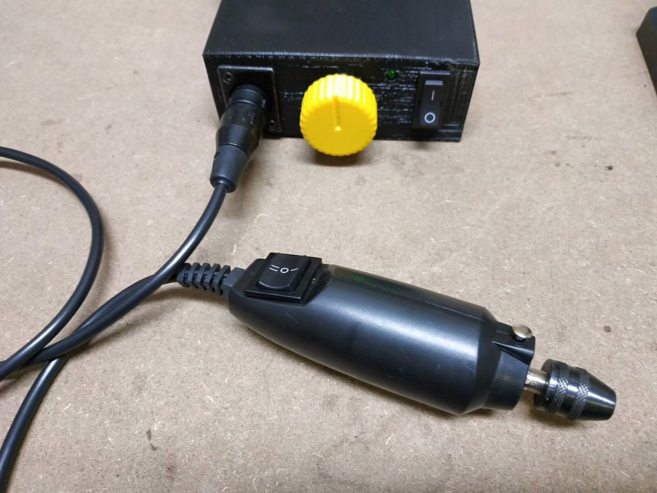 Jako základ mi posloužila čínská noname vrtačka na 12V, kterou jsem přestavěla k obrazu svému, a ke které jsem si postavila i vlastní napájecí zdroj s regulací otáček. Vrtačka má maximální výkon 96 wattů a pulsní regulaci od 0 do 25000 otáček za minutu. Sklíčidlo umožňuje upevnit nástroje o průměrech 0.2 – 3.2 mm. Vrtačka má vnější průměr 38 mm, takže bez problému zapadne do většiny stojanů pro mini vrtačky, které jsou na trhu, a také se velice dobře drží i v menší dlani.