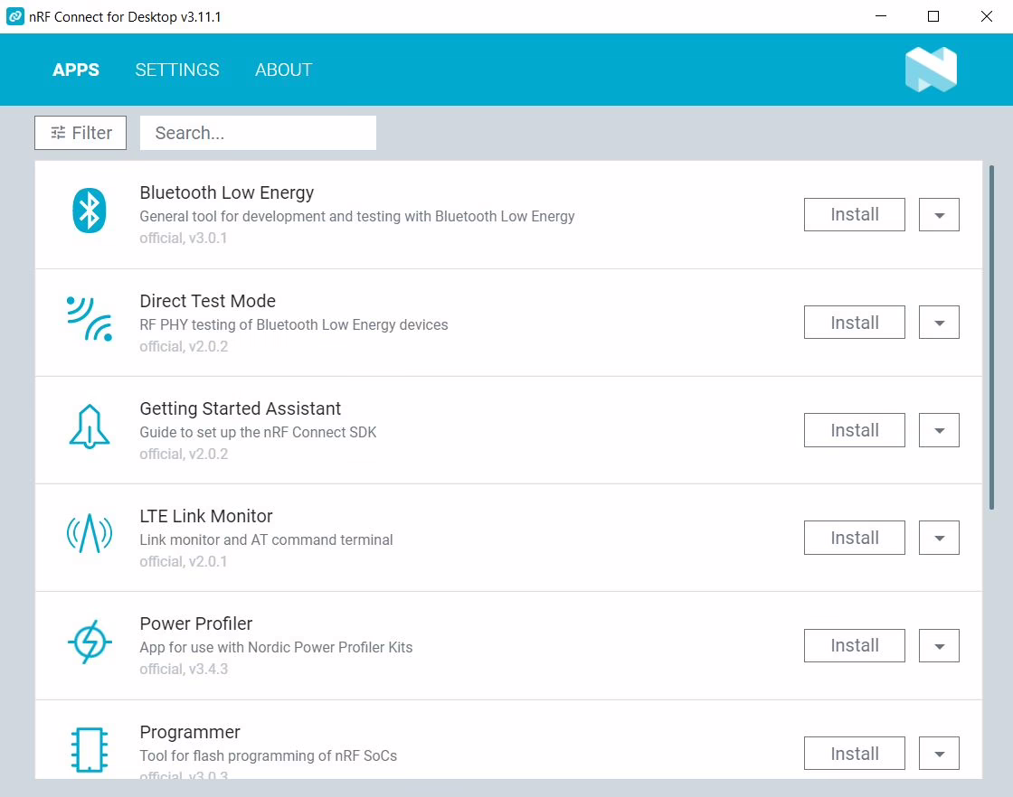 nRF Connect je univerzální software pro více různých zařízeních. Po spuštění programu nainstaluje Power Profiler.