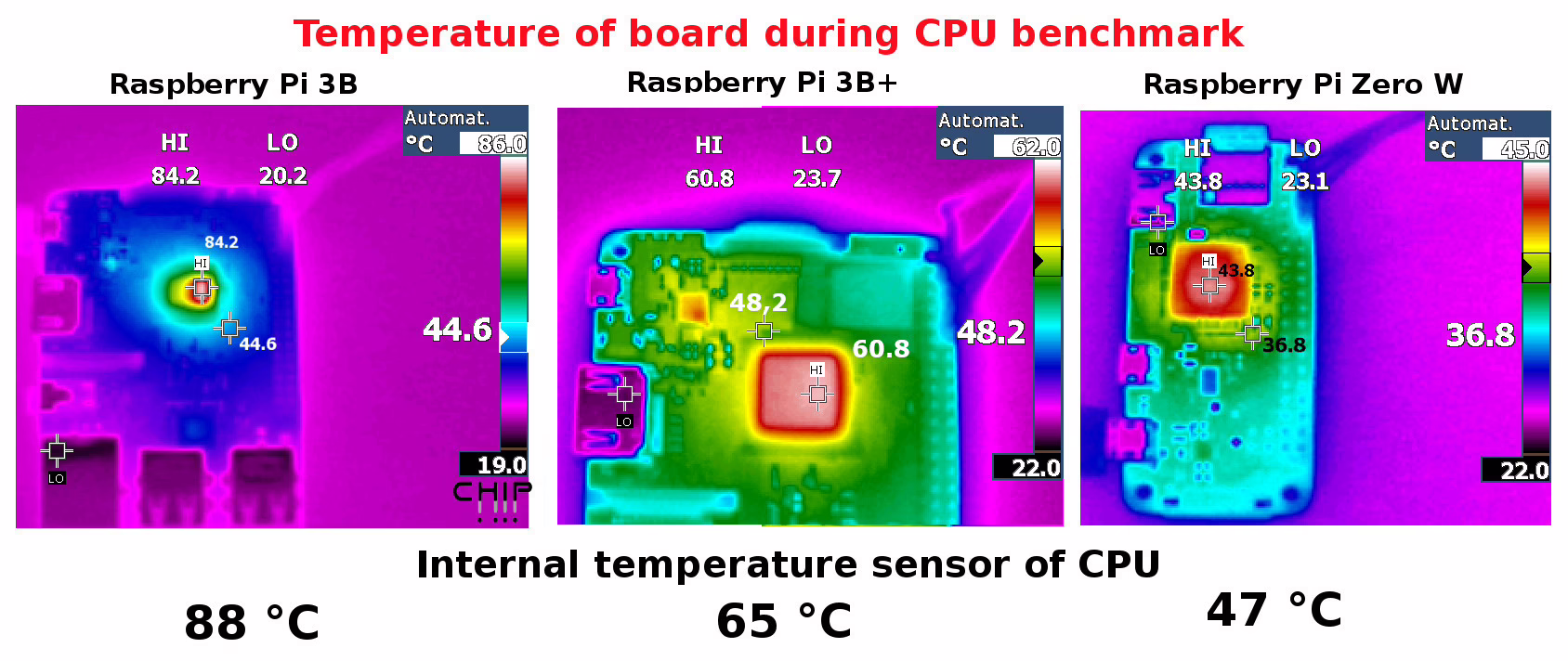 Jak můžete vidět na obrázku, odvod tepla od CPU u nového Raspberry Pi 3B Plus je mnohem lepší.