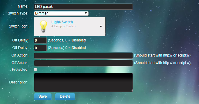 Pokud chceme z Domoticz řídit i jas LED pásku je zapotřebí editovat spínač v Domoticz. Přejdeme tedy do záložky Switches a zde klikneme na edit. Zde už stačí změnit Switch Type na Dimmer.
