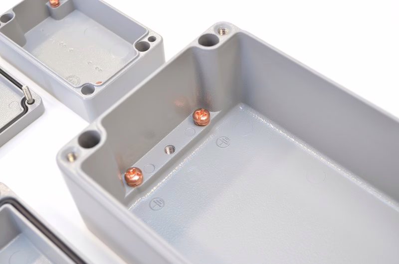 Krabičky jsou zvenku i zevnitř ošetřeny odolnou práškovou polyesterovou barvou. Velkou výhodou pro mnohé aplikace bude pravděpodobně snadná možnost uzemnění, neboť ve víku i ve dnu krabičky jsou již závity a šrouby M6/M4 pro uzemnění a montáž elektroniky.