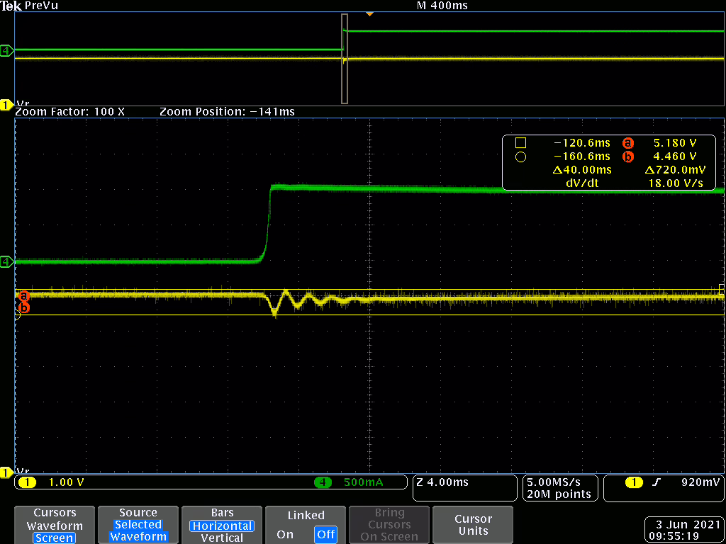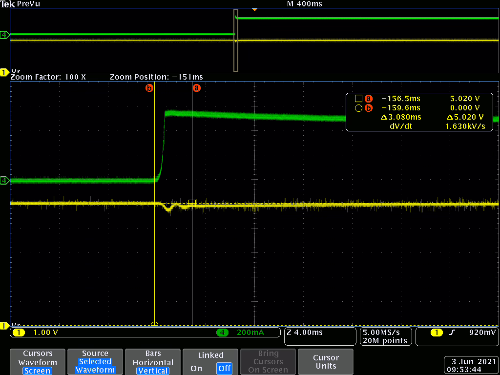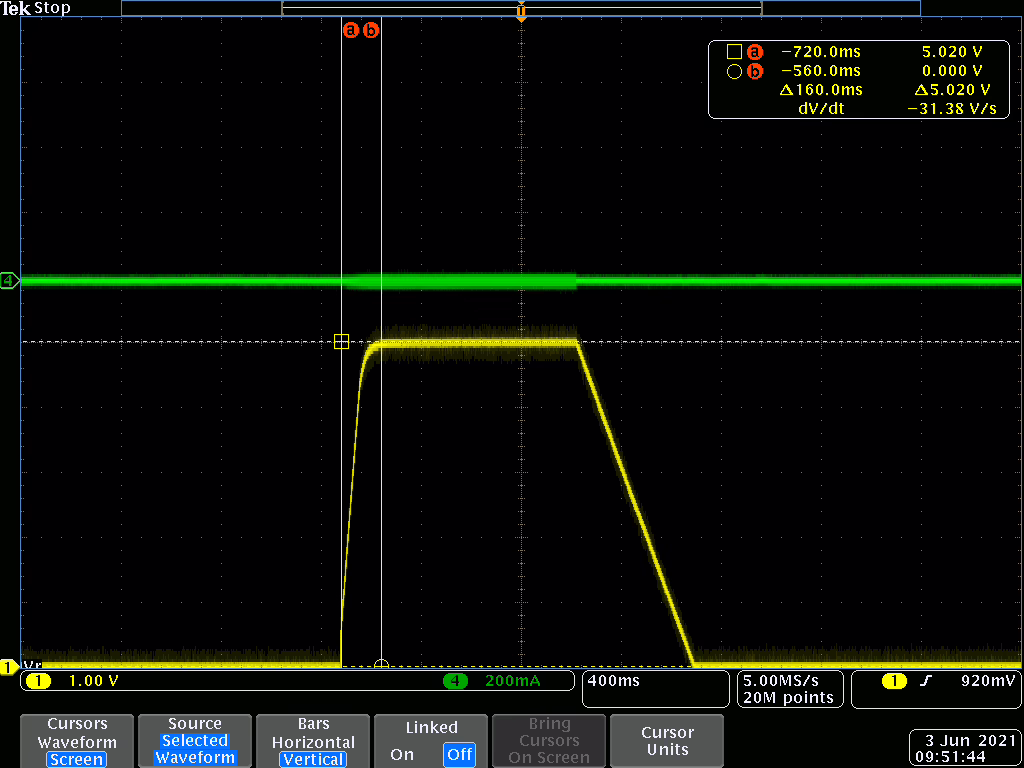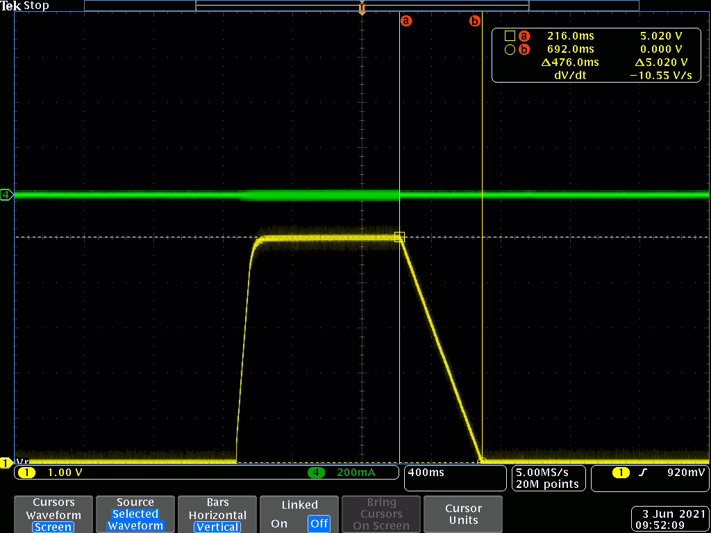 Bez zátěže naběhl zdroj na požadovanou hodnotu (5V) během 160ms, vypnutí a vybití kondenzátorů pak trvalo 470ms.
