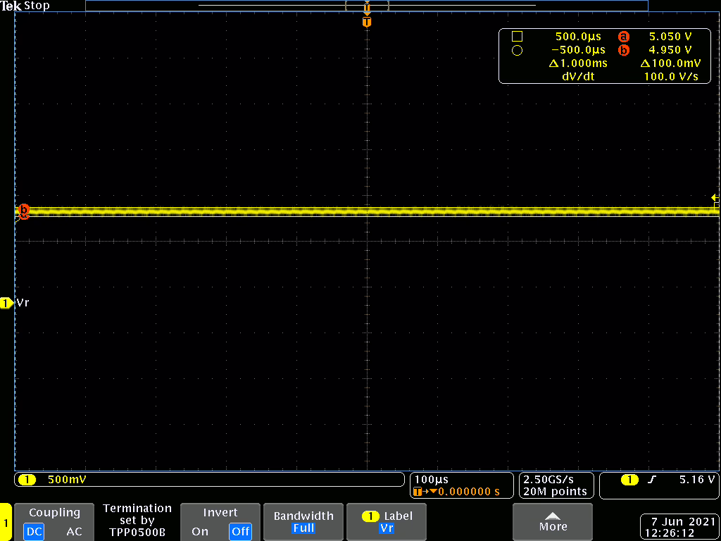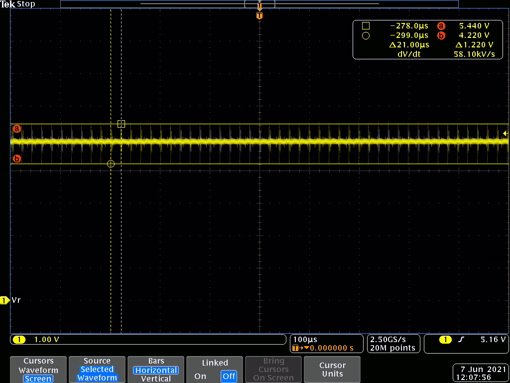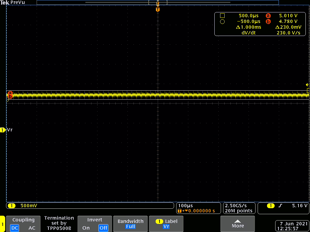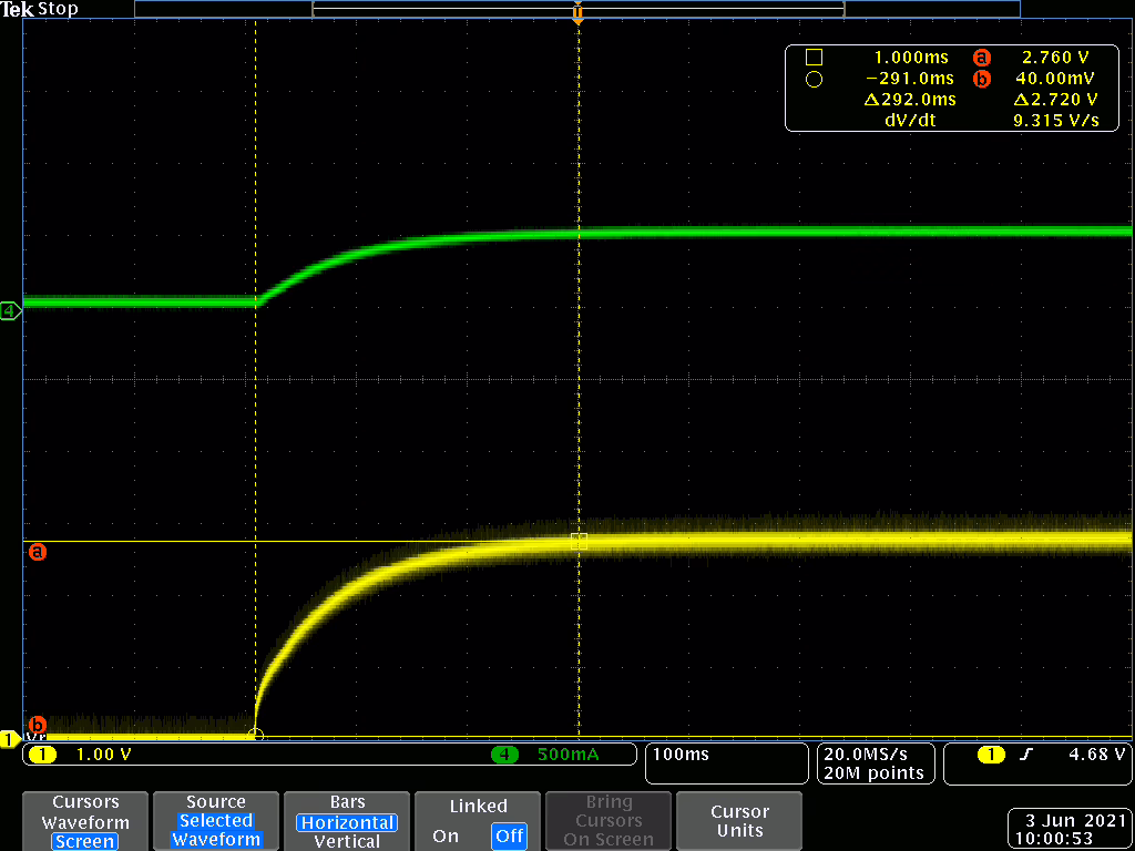 Bez zátěže naběhl zdroj na požadovanou hodnotu (5V) během 160ms, vypnutí a vybití kondenzátorů pak trvalo 470ms.