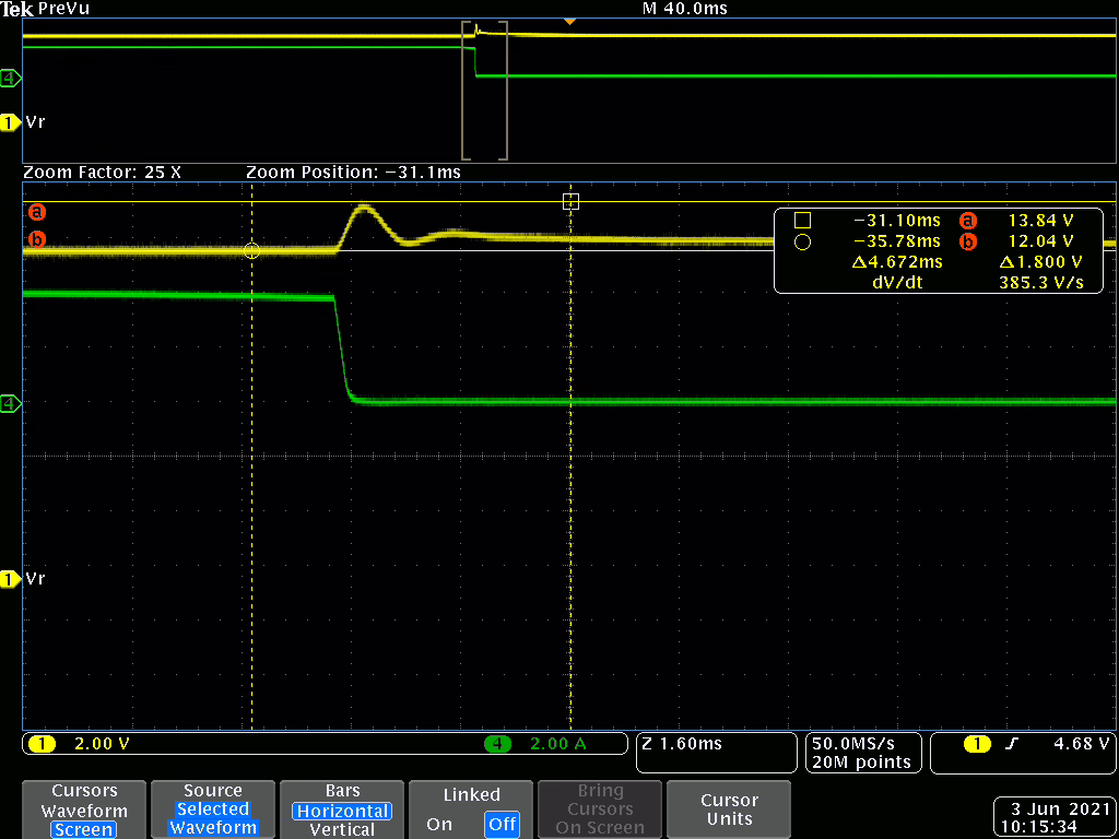 Velikost překmitu po vypnutí zdroje se zátěží 48 W dosahuje hodnoty 1.8 V. Pro hodnotu 12V a 2A je tato hodnota pak 1V.