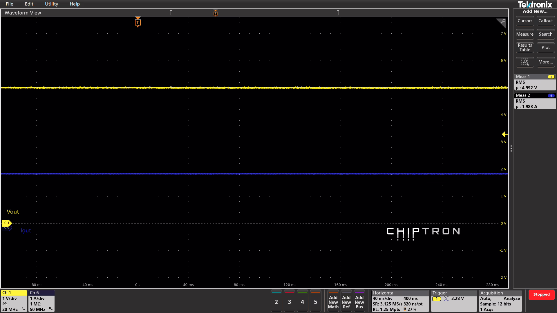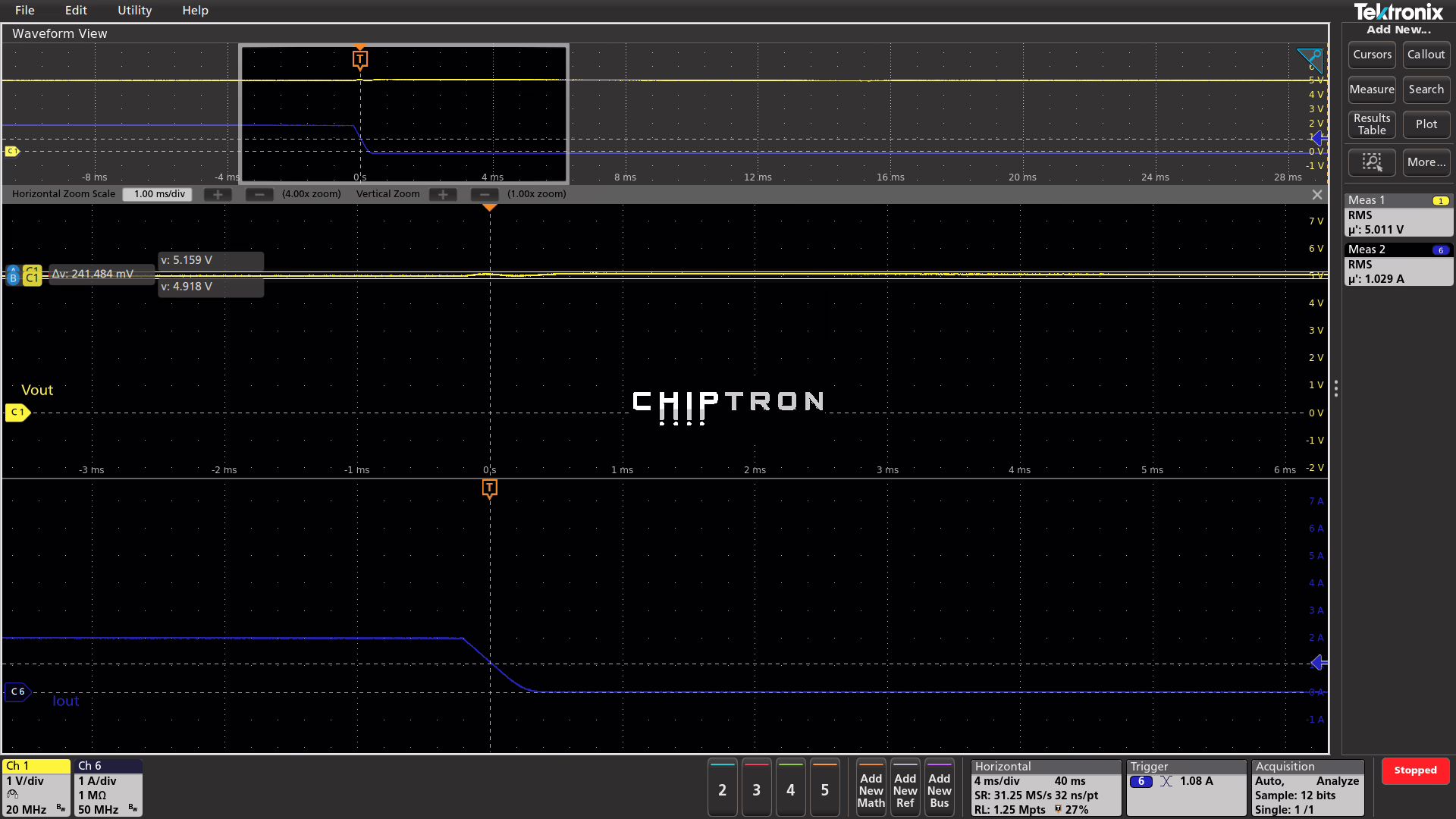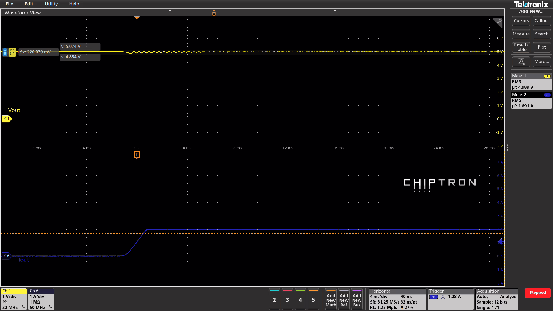 Start zdroje, výstup 5V se zátěží 1A (e-load, CC mode)