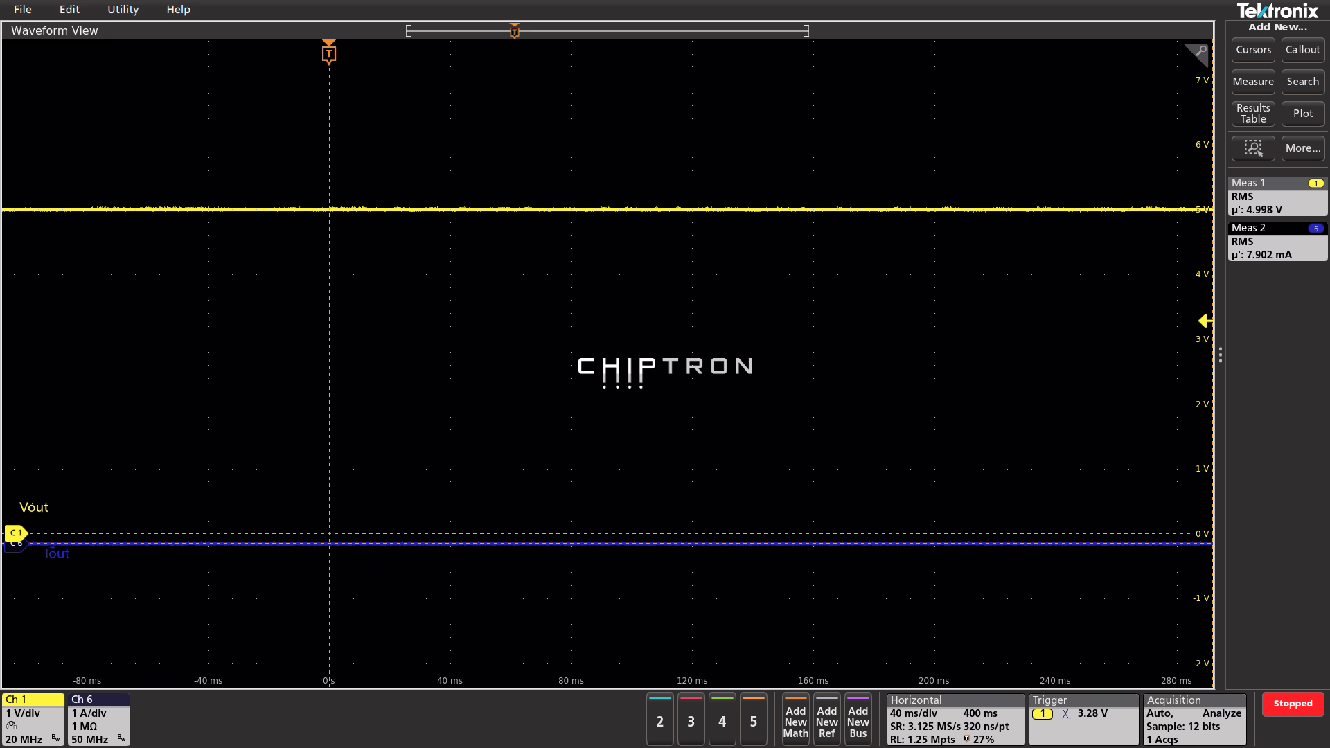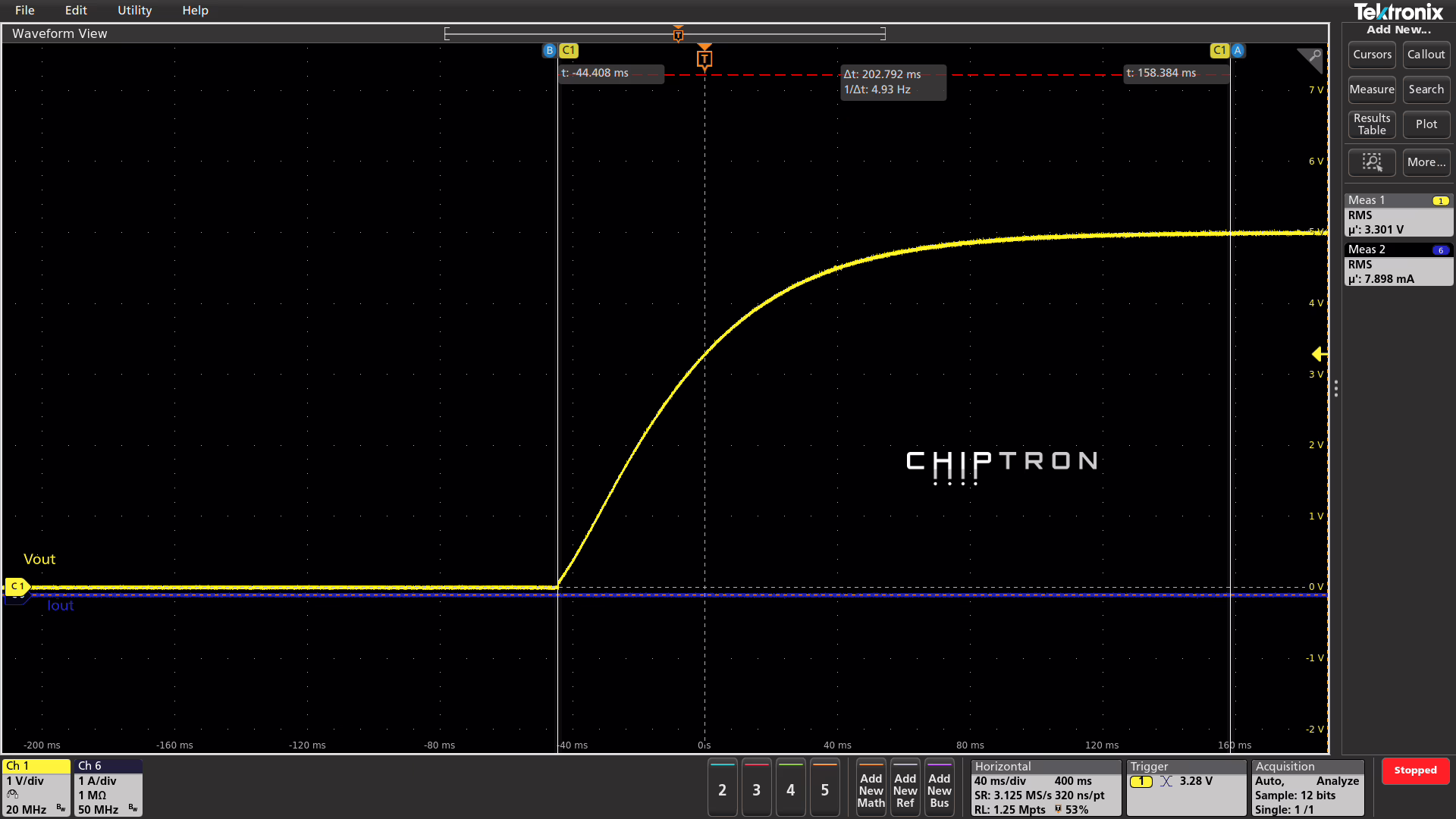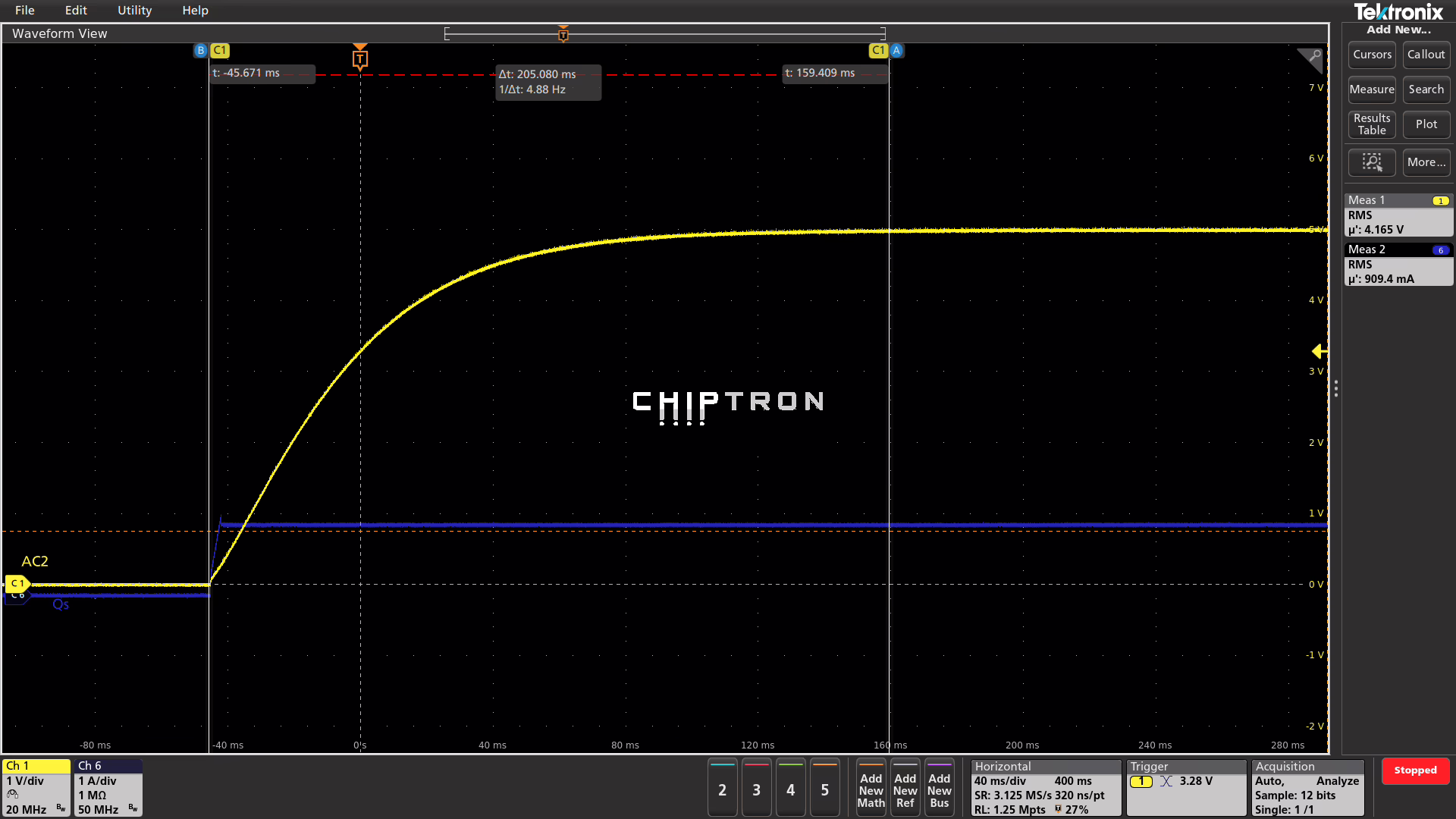 Start zdroje, výstup 5V se zátěží 1A (e-load, CC mode)