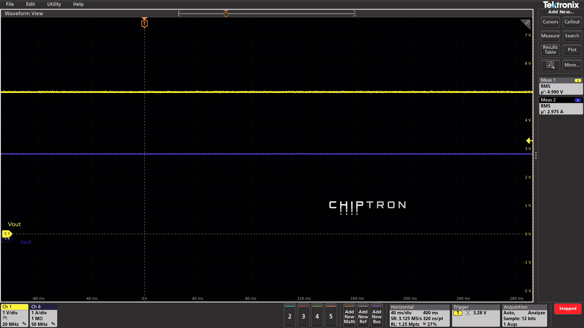 Start zdroje, výstup 5V se zátěží 3A (e-load, CC mode)