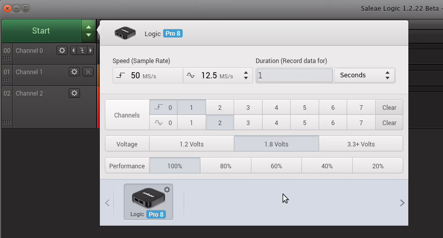 Pokud vlastníte originální Saleae logický analyzátor, v Menu (Start) najdete nastavení zařízení. Nastavení digitálních a analogových vstupů, vzorkovací rychlost a tak dále.