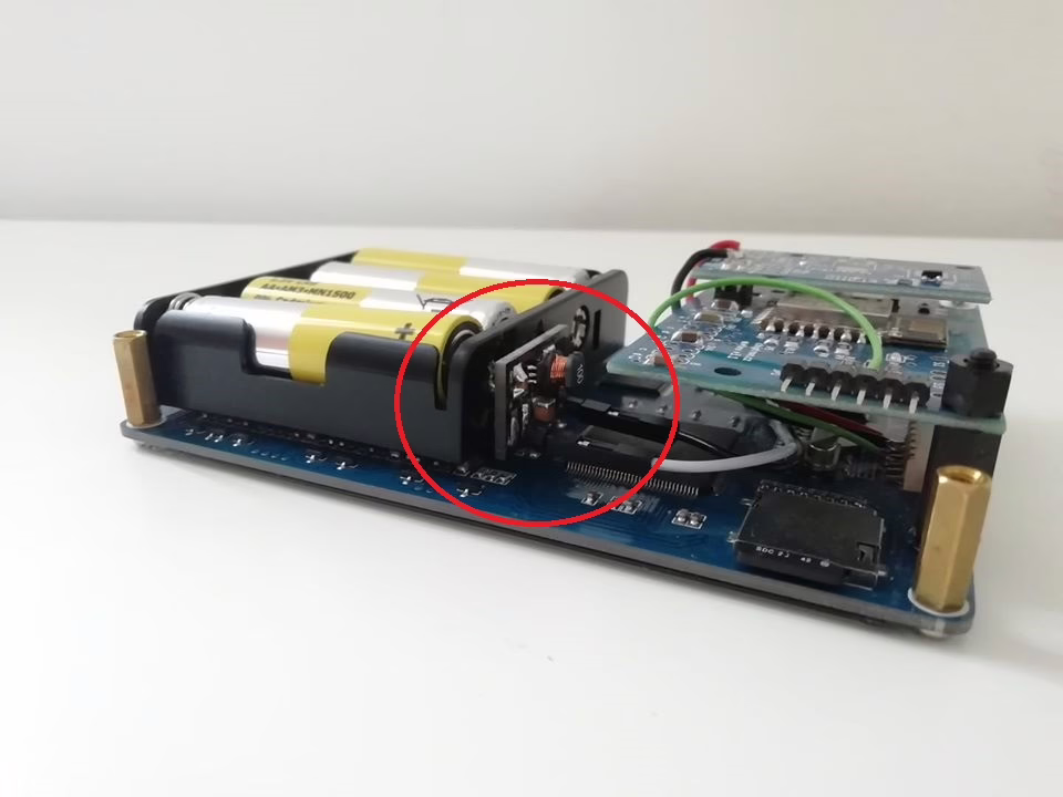 Měnič je napájen ze 4 AA baterií a výstupní napětí je 3.1V což je dostatečné napětí jak pro ESP8266, tak i eInk.