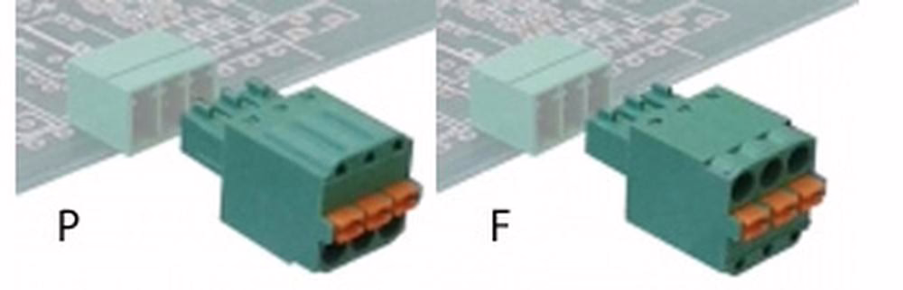 Tyto jsou ve dvou vyhotoveních. F (in-line) verze – připojený vodič je v ose s kolíkem v protikusu. Tato verze je i naším skladovým typem. Druhá je P verze (off-set) – jakoby vzhůru nohama. Konektory v rastru 3,5 resp. 3,81mm jsou určeny pro vodiče do průřezu 1,5mm2 (maximální proud 8A) a napětí do 160V.