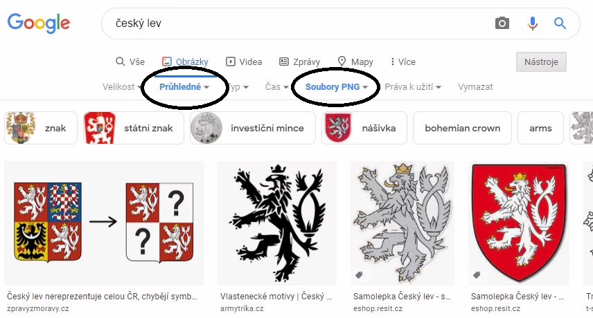 Opět vyhledáme Český lev a upravíme nastavení: soubor PNG, barva: Průhledná.