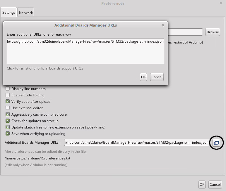 Proklikáte se na File -> Preferences -> a kliknete na ikonu, která je zvýrazněná na obrázku níže. Do okna Additional Boards Manager URLs pak zadáte následující řádek