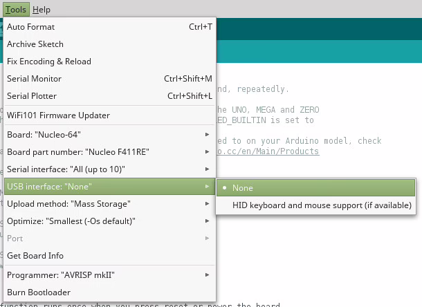 Vývojové desky Nucleo a Discovery obsahující programátor/debugger STLink v2.1 se připojí k počítači jako klasický FLASH disk. Zkompilovaný kód stačí zkopírovat do příslušného zařízení. To dělá Arduino IDE automaticky, při volbě Mass Storage.